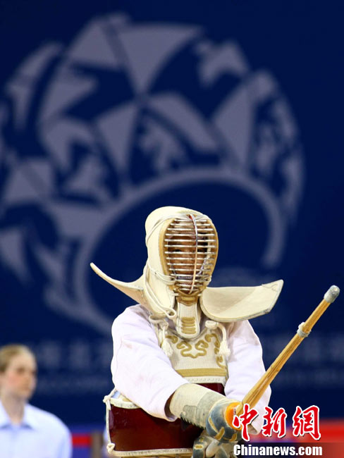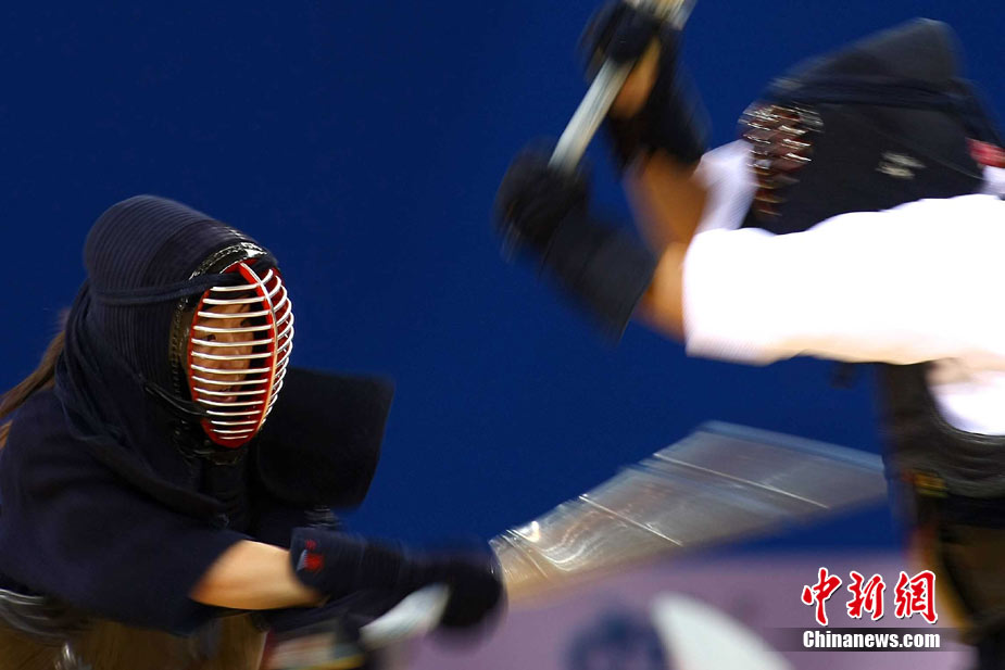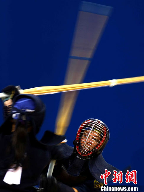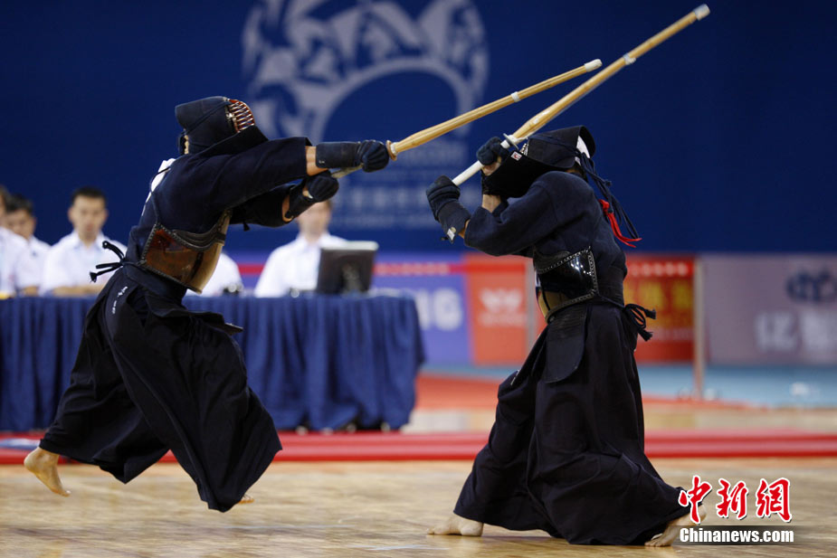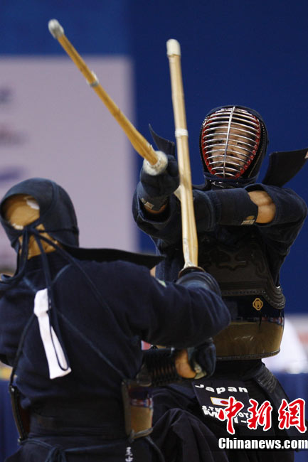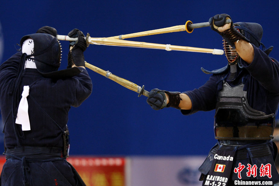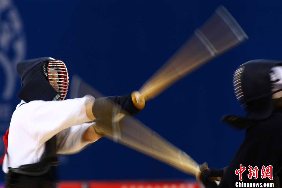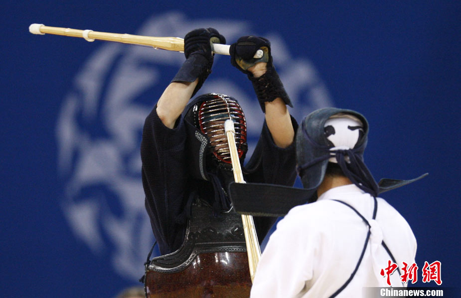 9月3日,2010年北京首屆世界武搏運(yùn)動(dòng)會(huì)劍道比賽在北京科技大學(xué)體育館開賽,當(dāng)天舉行男、女個(gè)人賽預(yù)賽和決賽及女子特殊邀請(qǐng)賽預(yù)賽和決賽。圖為在男子個(gè)人邀請(qǐng)賽中,日本選手昭司寺本(Shoji TERAMOTO)(右)和巴西選手奧納卡(Ernesto Eisaku ONAKA)在比賽中。中新社記者 盛佳鵬 攝