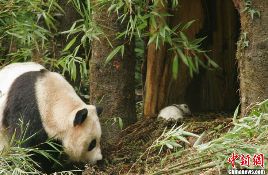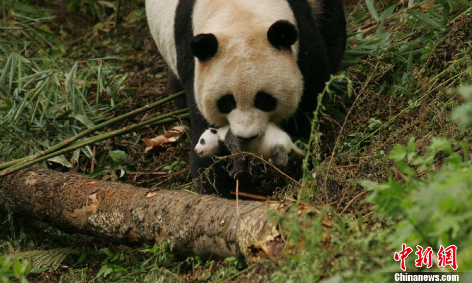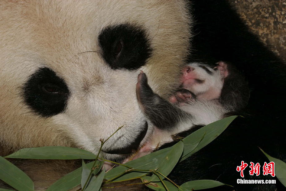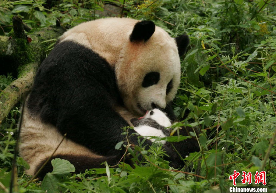 9月4日從臥龍中國保護大熊貓研究中心獲悉,全球首只在野化培訓基地誕生的大熊貓寶寶----“草草”的幼仔已滿月。在8月3日降生于臥龍“核桃坪”野化培訓基地后的一個月里,科研人員按預(yù)先計劃順利開展了相關(guān)研究工作,讓“草草”帶著寶寶先在一個條件相對簡單的環(huán)境中生活,目前,幼仔生長狀況良好,從出生時的205克增長到了1235克,身體健康,活力強。中新社發(fā) 曾昌霞 攝
