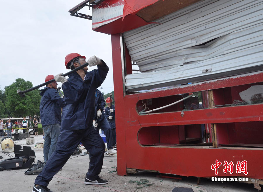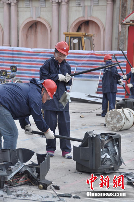 9月4日,一群全副武裝、手持鐵錘的都市人在長沙世界之窗內(nèi)廣場上瘋狂錘砸廢舊小鐵屋,以此宣泄心中的壓力。據(jù)悉,為幫助都市人群釋放因工作、生活帶來的壓力和郁悶,長沙世界之窗從當日開始舉行為期一個月的減壓節(jié)。主辦方將收集來的摩托車、小車、電視機、洗衣機等廢舊設備擺放在預設的場地內(nèi),每天召集數(shù)十名游客參與其中。 中新社記者 肖前輝 攝