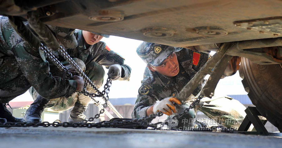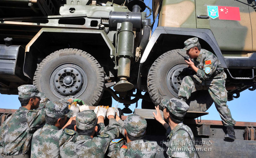 顧不上長途奔波和路途勞累的參演官兵,到達(dá)換裝點(diǎn)后就立即開始了換乘換裝。經(jīng)過近6小時(shí)的卸載、裝載,中方參演部隊(duì)的裝備車輛全部駛上了哈方軍列,并在鐵路專業(yè)裝卸隊(duì)的協(xié)助下,對20噸以上輪式裝備按照哈方的要求進(jìn)行捆綁加固。
