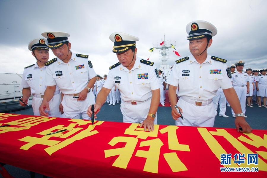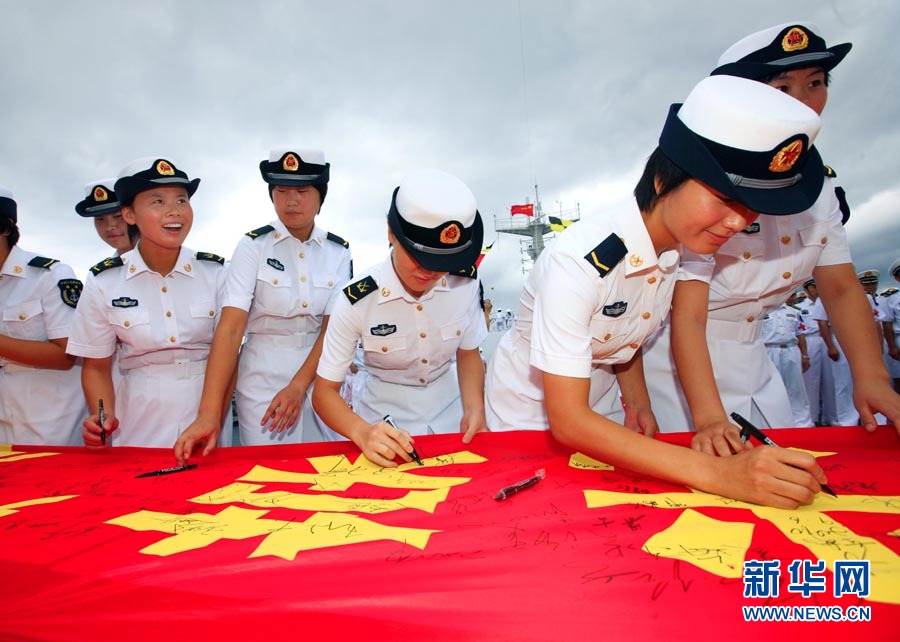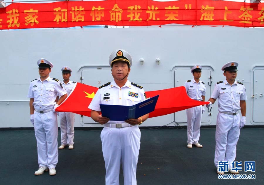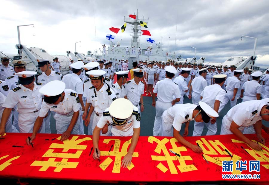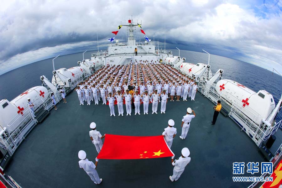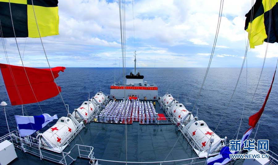 9月6日,“和平方舟”號(hào)醫(yī)院船舉行宣誓儀式。當(dāng)日,經(jīng)過連續(xù)多天的航行,前往亞丁灣海域及吉布提等亞非五國執(zhí)行“和諧使命—2010”任務(wù)的中國“和平方舟”號(hào)醫(yī)院船駛出國門。這是“和平方舟”號(hào)醫(yī)院船首次穿越南海駛向大洋。428名官兵及醫(yī)務(wù)人員全程參加這次為期87天的任務(wù),總航程將達(dá)1.5萬多海里。自8月31日駛離舟山碼頭后,醫(yī)院船經(jīng)受了“獅子山”“圓規(guī)”“南川”臺(tái)風(fēng)的考驗(yàn),穿越臺(tái)灣海峽、西沙群島和南沙群島,順利抵達(dá)南海。查春明 攝 圖片來源:新華網(wǎng)