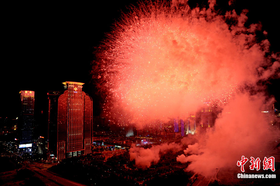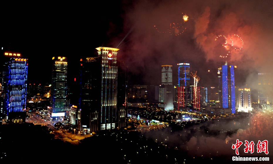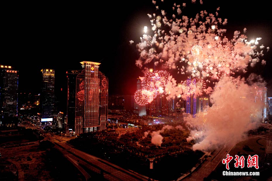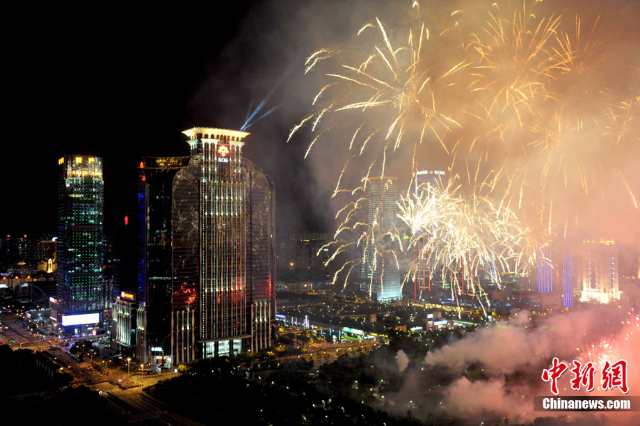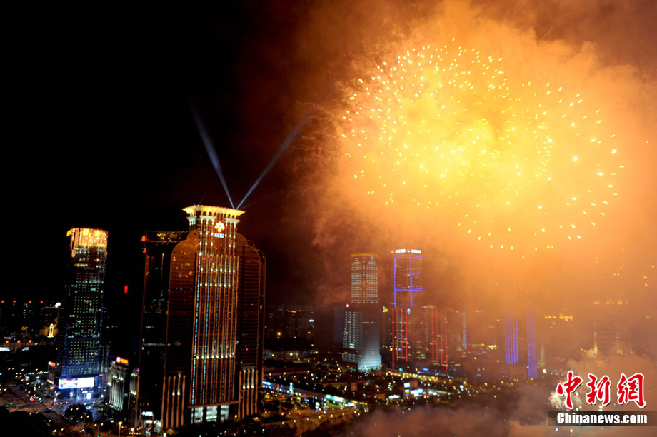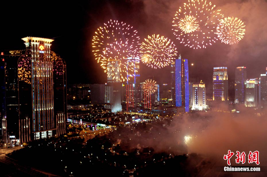 9月6日晚8點(diǎn)30分,深圳夜空璀璨絢麗,慶祝深圳經(jīng)濟(jì)特區(qū)建立30周年焰火晚會在深南大道水晶島舉行。今晚燃放煙花數(shù)量145107發(fā),主要品種19種,全長30分鐘,共四個(gè)樂章。深圳市民分別在蓮花山公園、市民中心、深南路、彩田路、會展中心等區(qū)域觀看深圳經(jīng)濟(jì)特區(qū)30周年慶典煙花晚會。中新社記者 陳文 攝