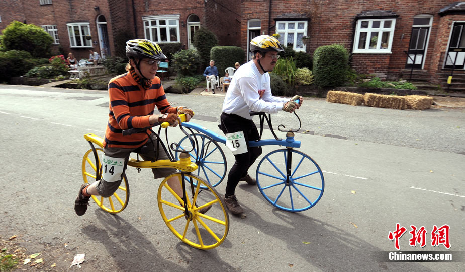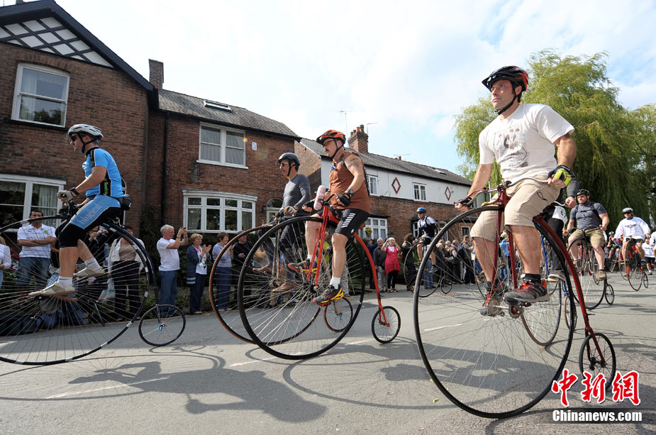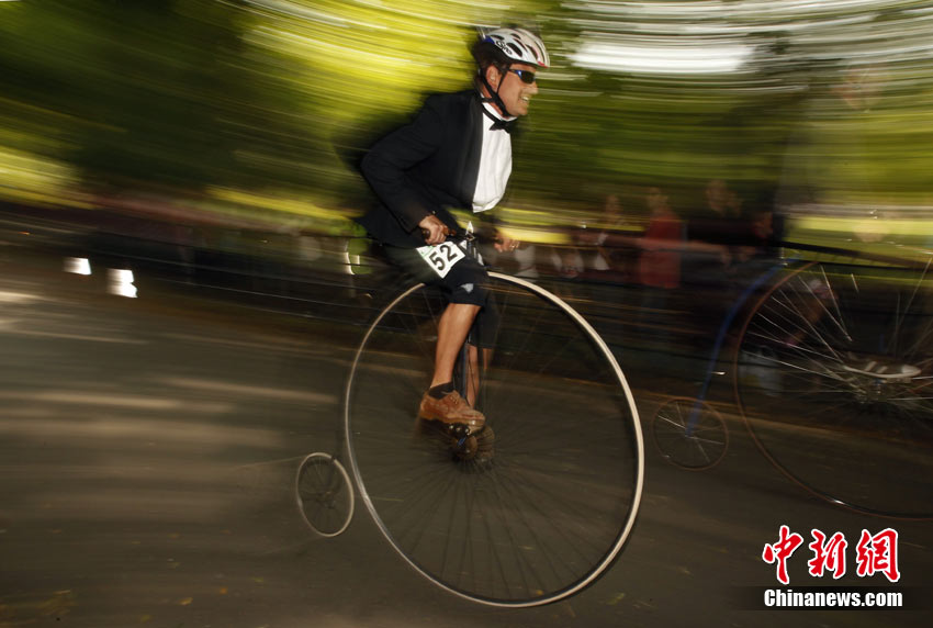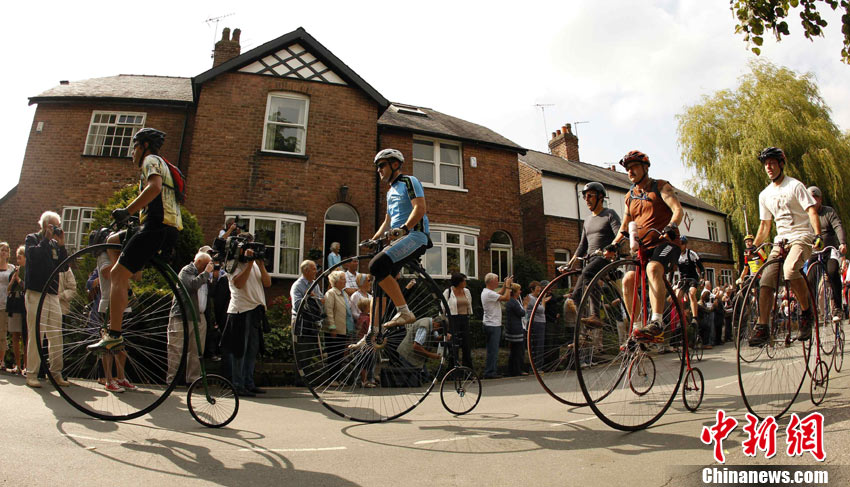 近日,英國(guó)大納茨福德舉行了復(fù)古自行車比賽。該項(xiàng)比賽每十年舉行一次,參賽者來(lái)自世界各地。他們須在三個(gè)小時(shí)的限時(shí)內(nèi)沿著一公里長(zhǎng)的賽道進(jìn)行騎行比賽。