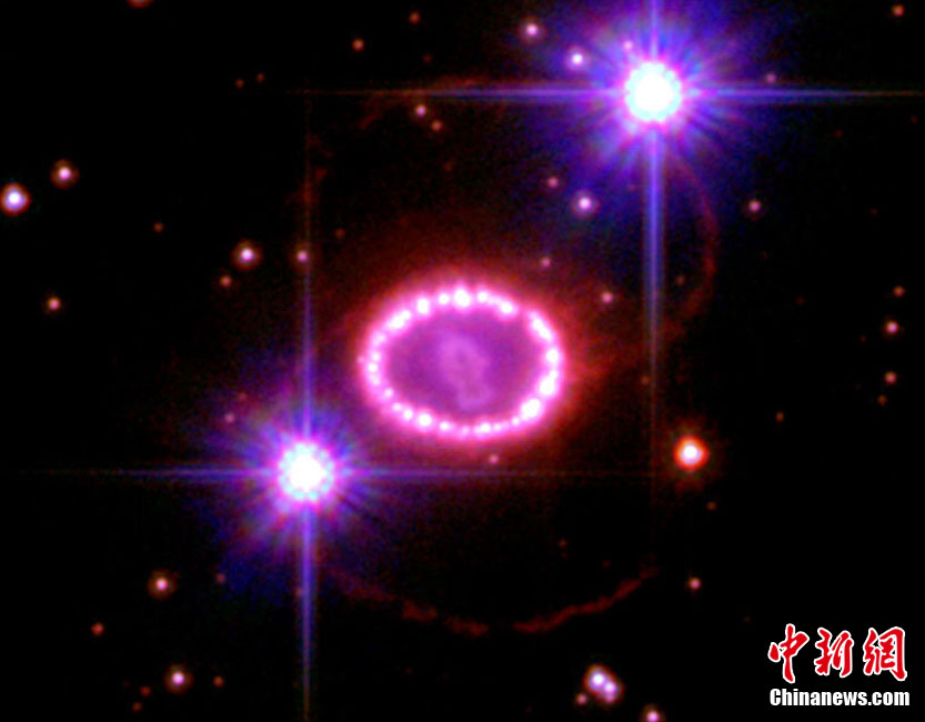 美國(guó)宇航局近日拍到一顆名為1987A的超新星爆發(fā)時(shí)形成的美麗“星膽”,而這場(chǎng)絢麗的爆發(fā)距離地球約16.3萬(wàn)光年。“星膽”中圍繞著超新星爆發(fā)后留下的30到40個(gè)閃亮的殘余物,形成一個(gè)直徑約9.6萬(wàn)億公里的圓環(huán),酷似由一顆顆璀璨的珍珠串成的項(xiàng)鏈。
