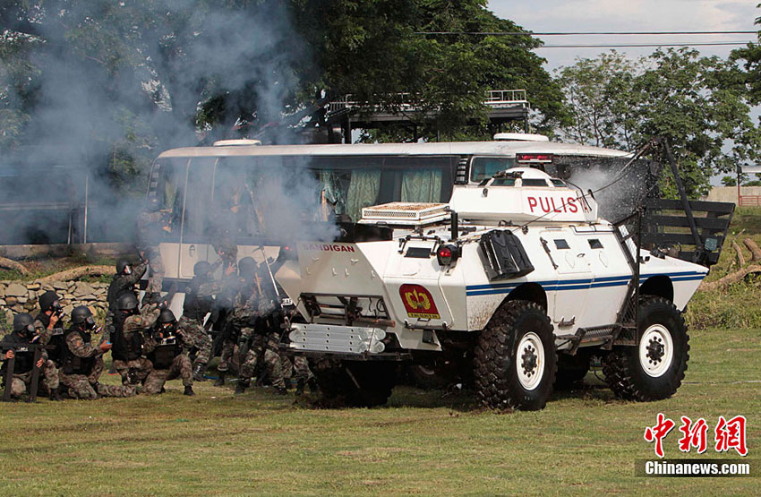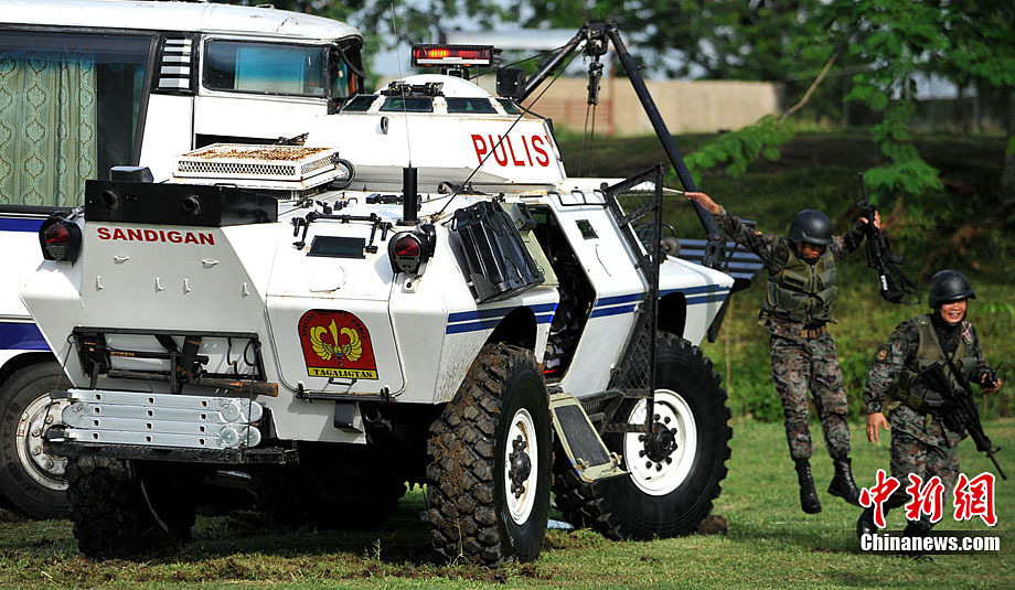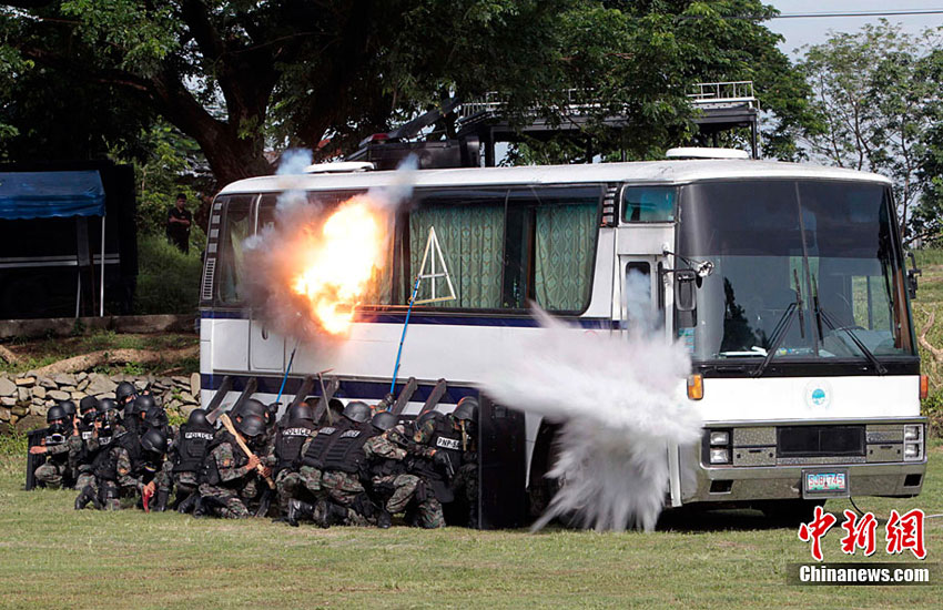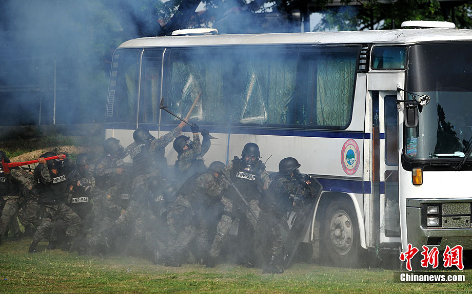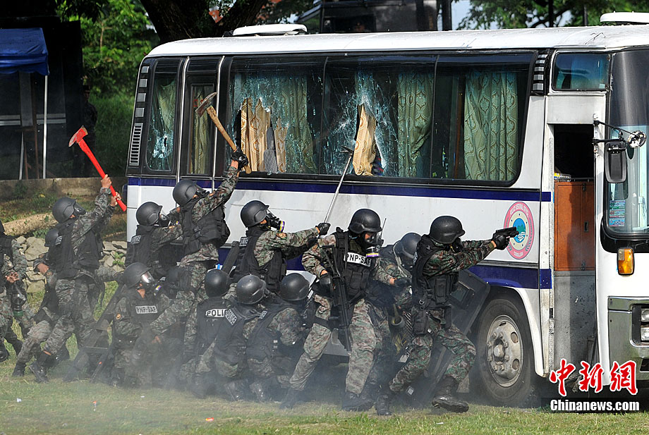 當(dāng)?shù)貢r(shí)間9月9日,菲律賓警察特別行動部隊(duì)成員在菲律賓首都馬尼拉附近的營地舉行了人質(zhì)救援演習(xí)。菲律賓總統(tǒng)阿基諾三世親自前往觀看該救援演習(xí)。