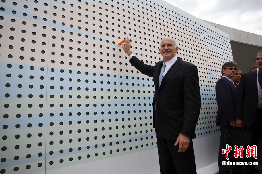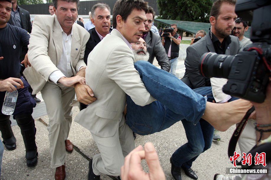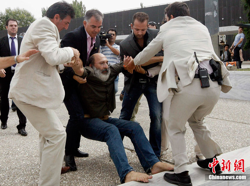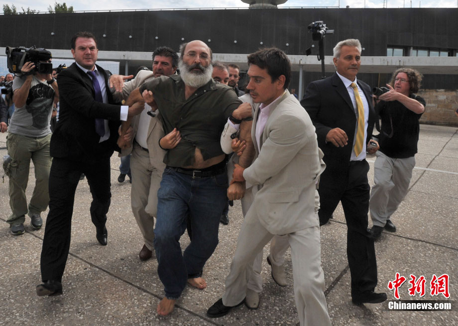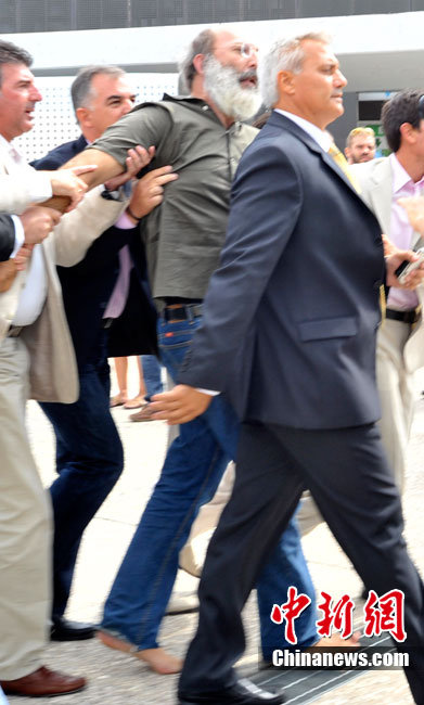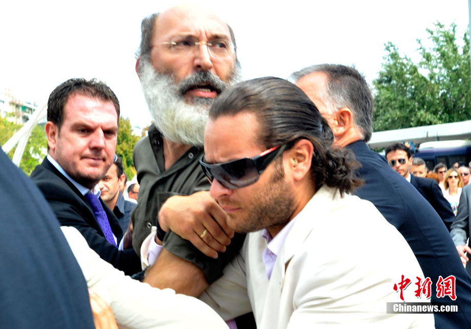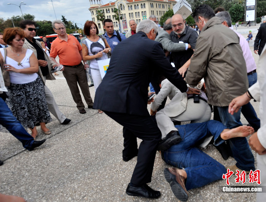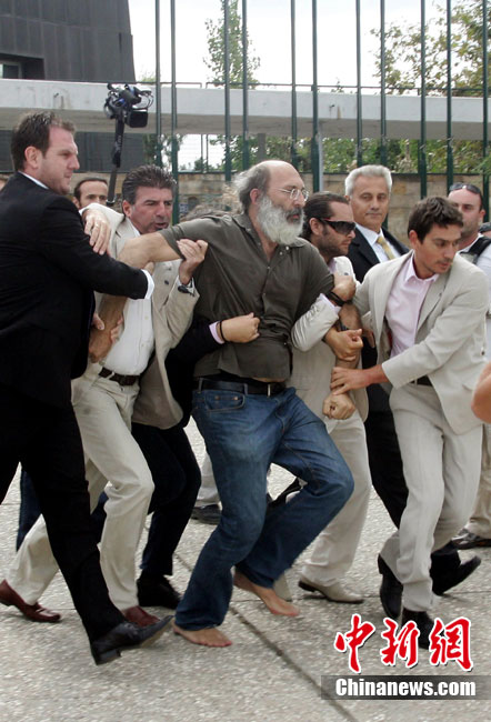 當(dāng)?shù)貢r(shí)間9月11日,在希臘北部城市塞薩洛尼基,希臘總理帕潘德里歐參觀塞薩洛尼基國際博覽會(huì)時(shí)遭一男子擲鞋襲擊,但沒有被鞋擊中。