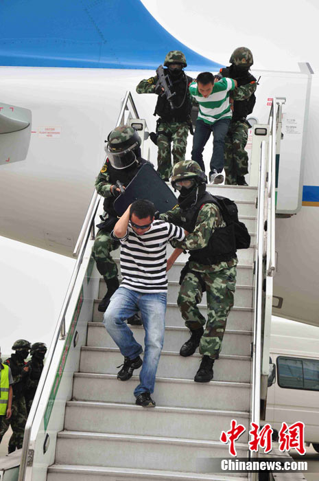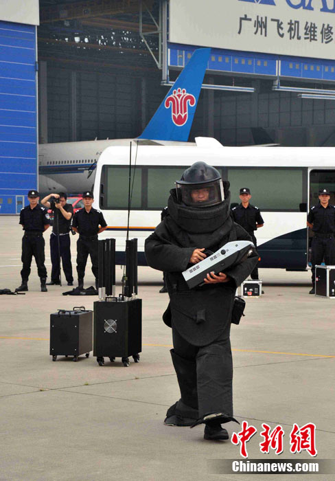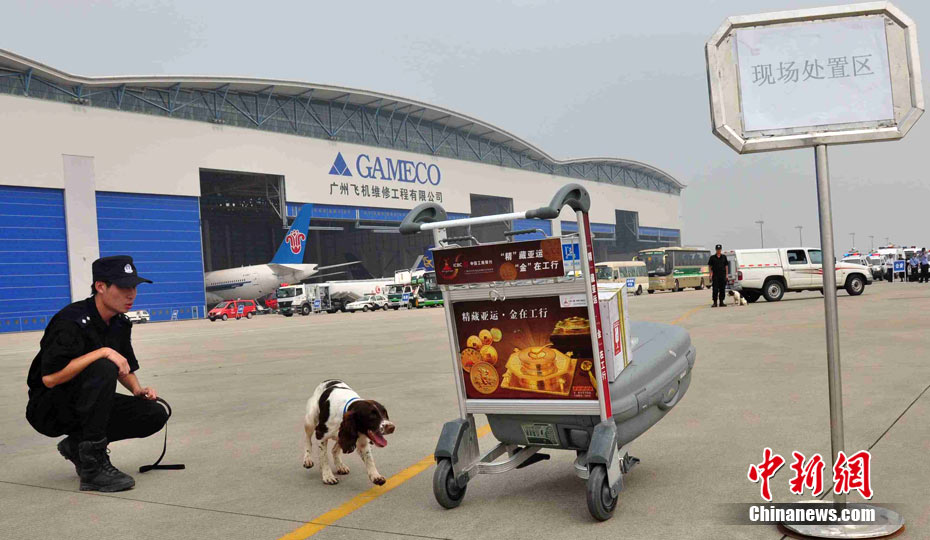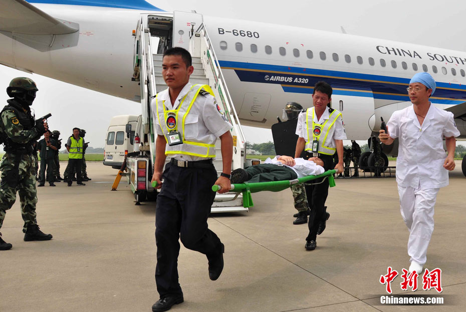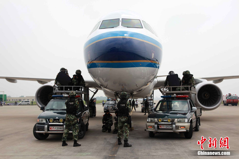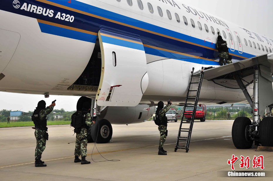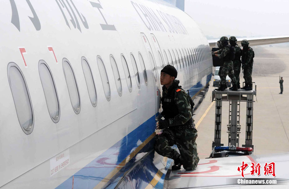 為確保平安亞運的目標(biāo),提升白云機場的反恐能力,9月12日下午,白云機場亞運安保力量重裝集結(jié),舉行大規(guī)模的反恐綜合演練。圖為反劫機特戰(zhàn)隊員控制飛機前后艙門準(zhǔn)備突擊。中新社發(fā) 云軒 攝