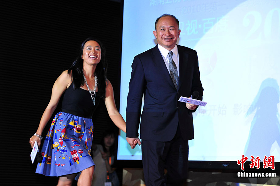 9月13日,“湖南衛(wèi)視·百度娛樂沸點2010年度盤點”啟動儀式暨第一、第二季度榜單公布儀式于北京舉行。剛剛獲得威尼期電影節(jié)“終身成就獎”的吳宇森導演攜女兒吳飛霞首次一起公開亮相內地。吳飛霞在吳宇森執(zhí)導,云集楊紫瓊、大S等眾多國際明星的最新武俠大片《劍雨》中出演了重要角色,她也成為現(xiàn)場媒體關注的焦點人物,然而從小在美國長大的吳飛霞國語水平看來有限,無奈只好講英文請老爸救急當翻譯,兩人現(xiàn)場大秀父女情深。中新社記者 李學仕 攝
