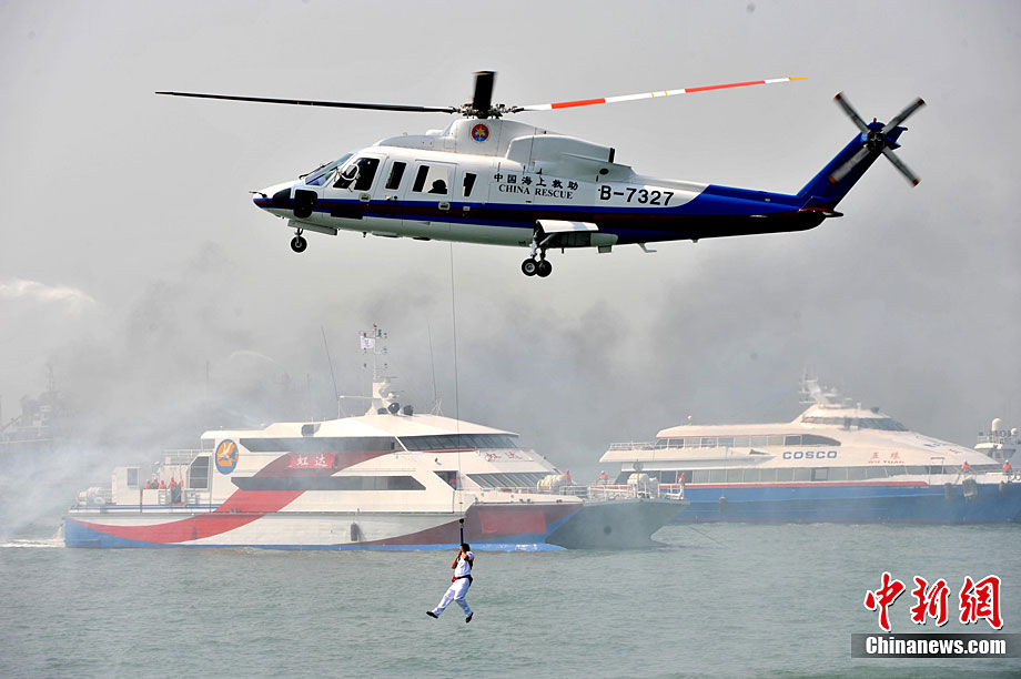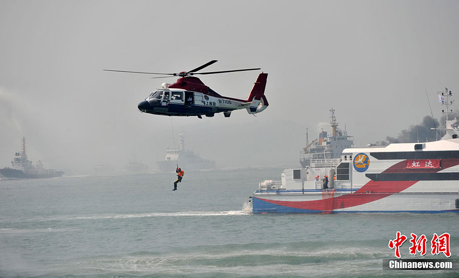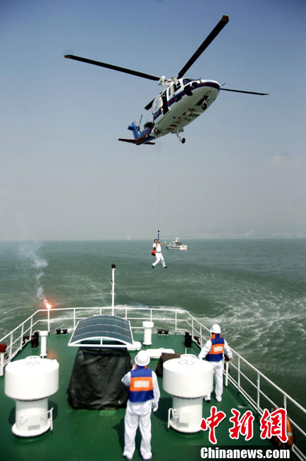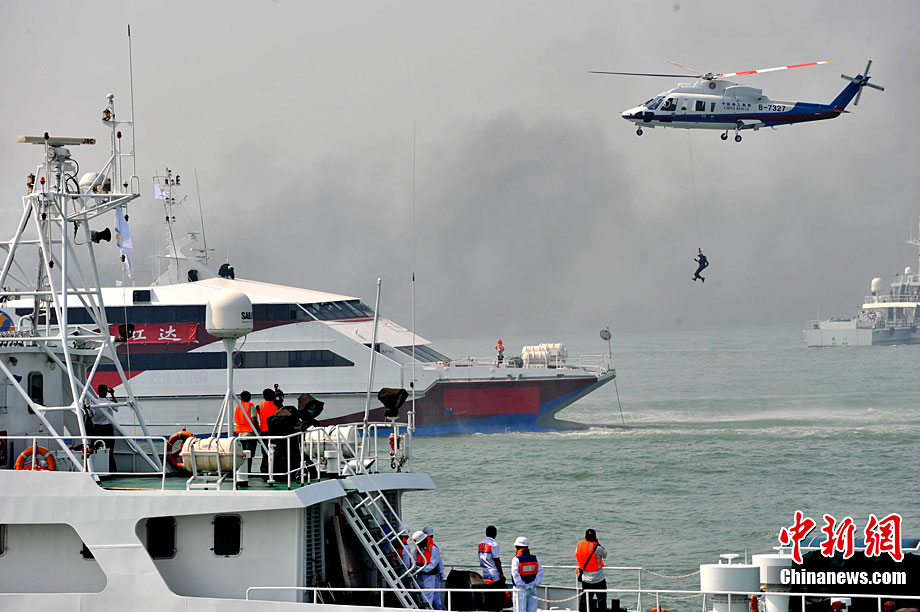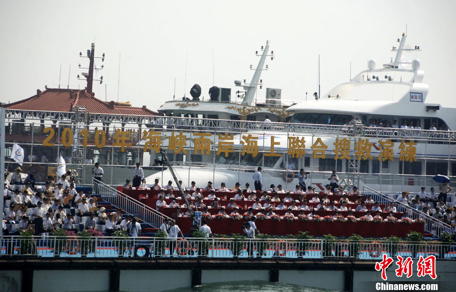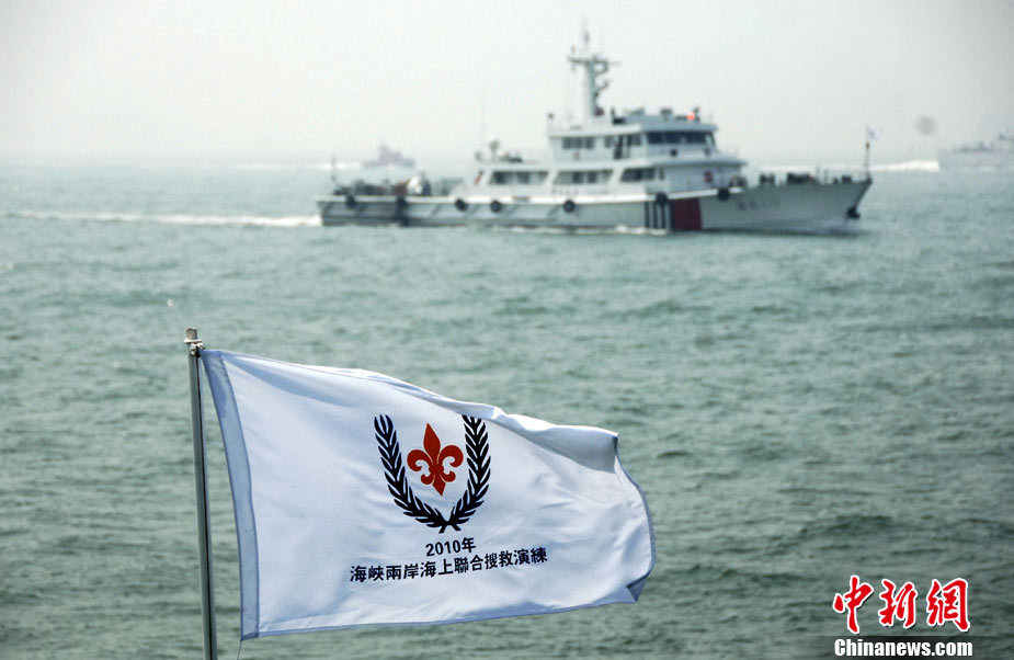 9月16日上午,2010年海峽兩岸海上聯(lián)合搜救演練在臺灣海峽的廈門、金門附近海域舉行。海峽兩岸海上搜救單位參演人數(shù)400多人,共動用搜救船舶14艘、救助飛機3架。其中大陸方面主要參演船舶9艘、救助直升機2架;臺灣方面主要參演船舶5艘、救助直升機1架。這是自2008年12月15日兩岸海上直航正式啟動以來,海峽兩岸海上搜救力量首次共同進(jìn)行的大規(guī)模海陸空聯(lián)合搜救演練。圖為演練現(xiàn)場。中新社發(fā) 王東明 攝