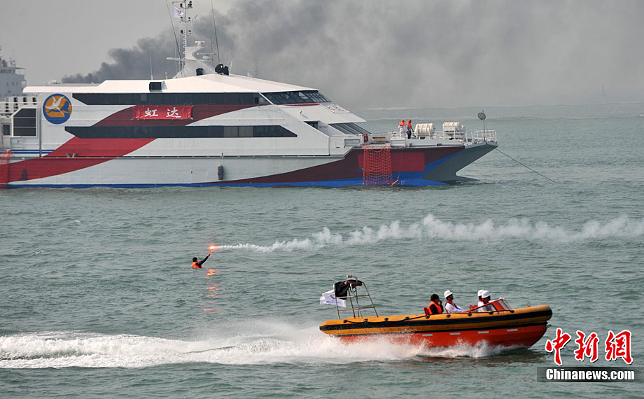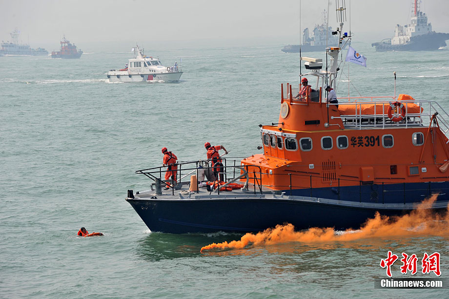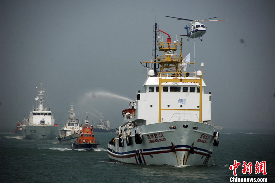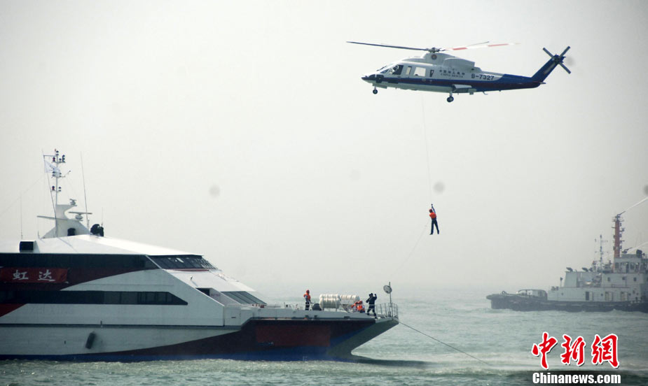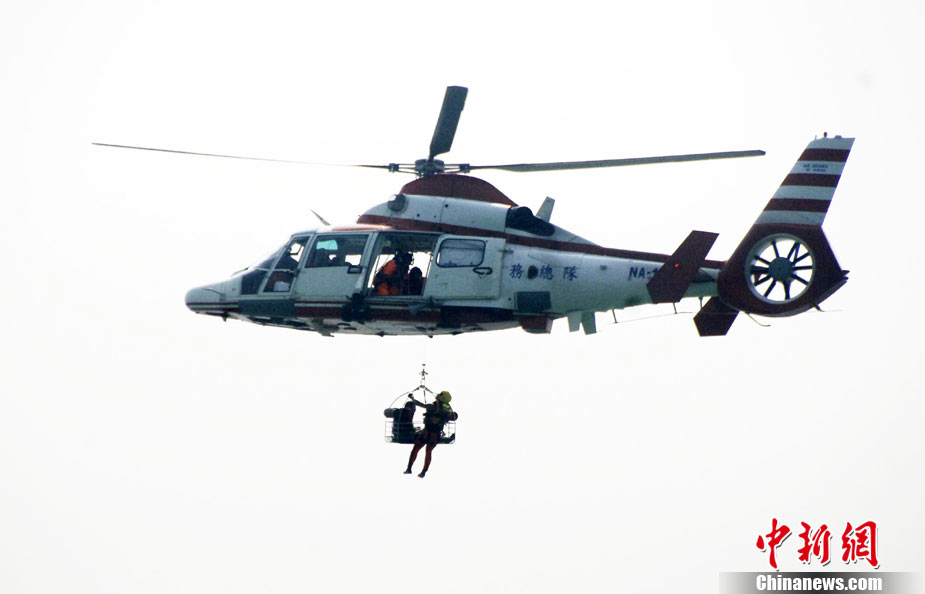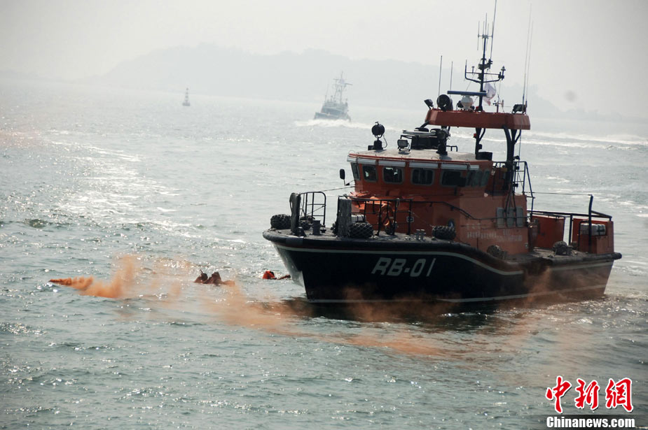 9月16日上午,2010年海峽兩岸海上聯(lián)合搜救演練在臺灣海峽的廈門、金門附近海域舉行。海峽兩岸海上搜救單位參演人數(shù)400多人,共動用搜救船舶14艘、救助飛機3架。其中大陸方面主要參演船舶9艘、救助直升機2架;臺灣方面主要參演船舶5艘、救助直升機1架。這是自2008年12月15日兩岸海上直航正式啟動以來,海峽兩岸海上搜救力量首次共同進(jìn)行的大規(guī)模海陸空聯(lián)合搜救演練。圖為演練現(xiàn)場。中新社發(fā) 王東明 攝