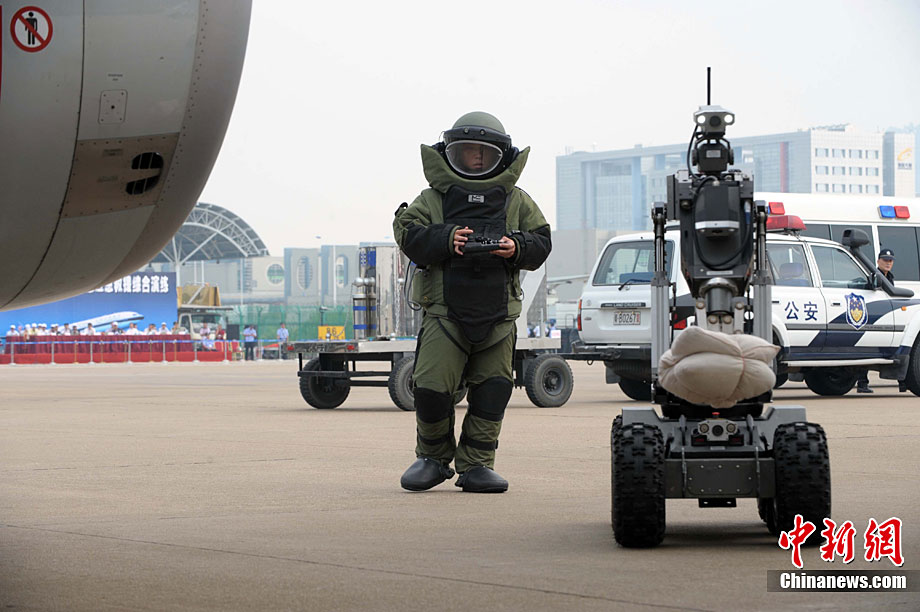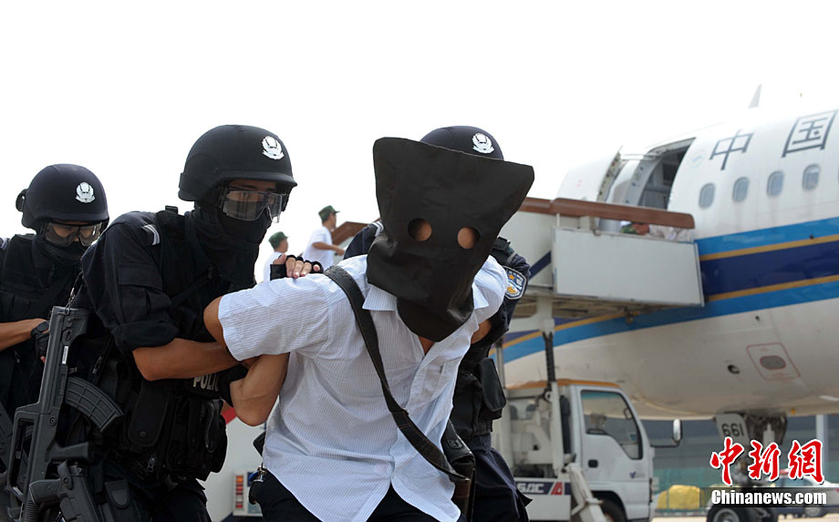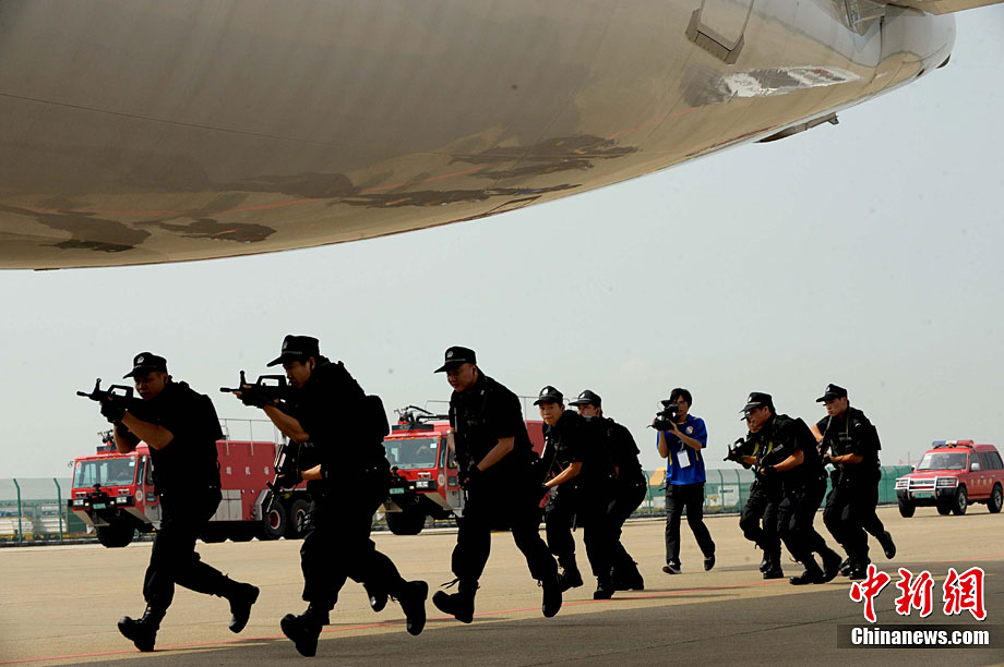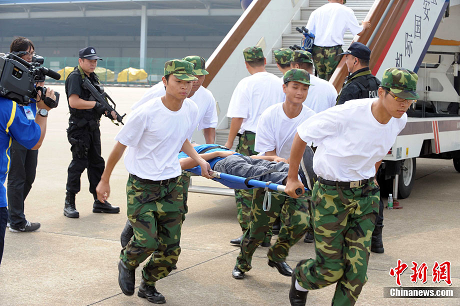 9月16日,深圳寶安國(guó)際機(jī)場(chǎng)舉行反恐應(yīng)急演習(xí),模擬一架客機(jī)被歹徒劫持后,特警、防爆、消防、醫(yī)療救護(hù)等各方面展開營(yíng)救,在短時(shí)間內(nèi)解救人質(zhì)處理事故。中新社記者 陳文 攝