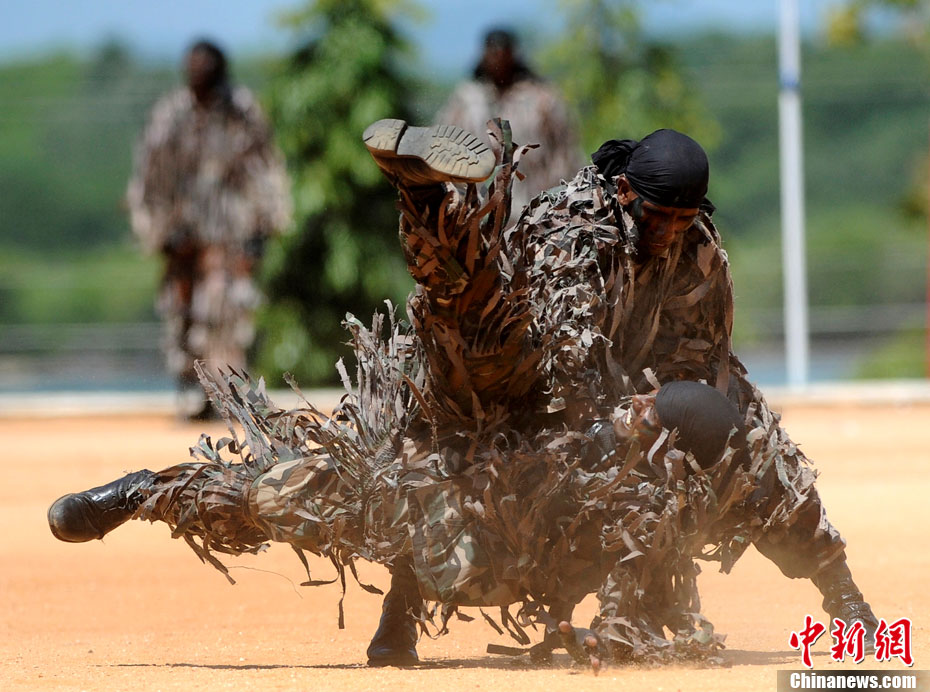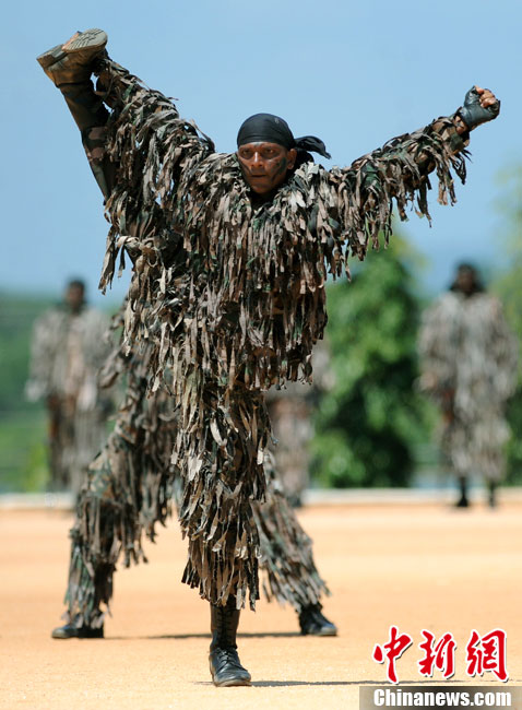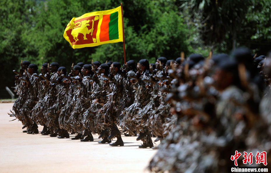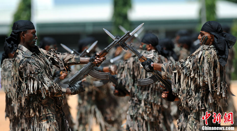 9月17日,在斯里蘭卡東北部城市亭可馬里舉行的空軍閱兵儀式上,116名空軍特種兵展示他們的各項(xiàng)技能。自2009年泰米爾猛虎組織(全稱(chēng),泰米爾·伊拉姆猛虎解放組織)的首領(lǐng)普拉巴卡蘭被擊斃,其基地被政府軍攻陷后,斯里蘭卡結(jié)束了長(zhǎng)達(dá)25年的內(nèi)戰(zhàn),軍隊(duì)實(shí)力不斷增加。