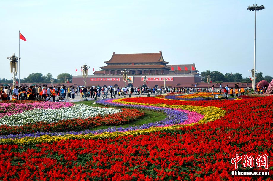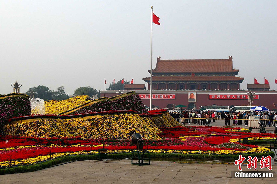 9月25日上午,北京市園林綠化局宣傳中心對外宣布,為了迎接建國61周年,天安門廣場主題為“花開盛世”的中心水法花壇已經(jīng)安裝完畢并正式亮相。吳間道 攝 圖片來源:cnsphoto