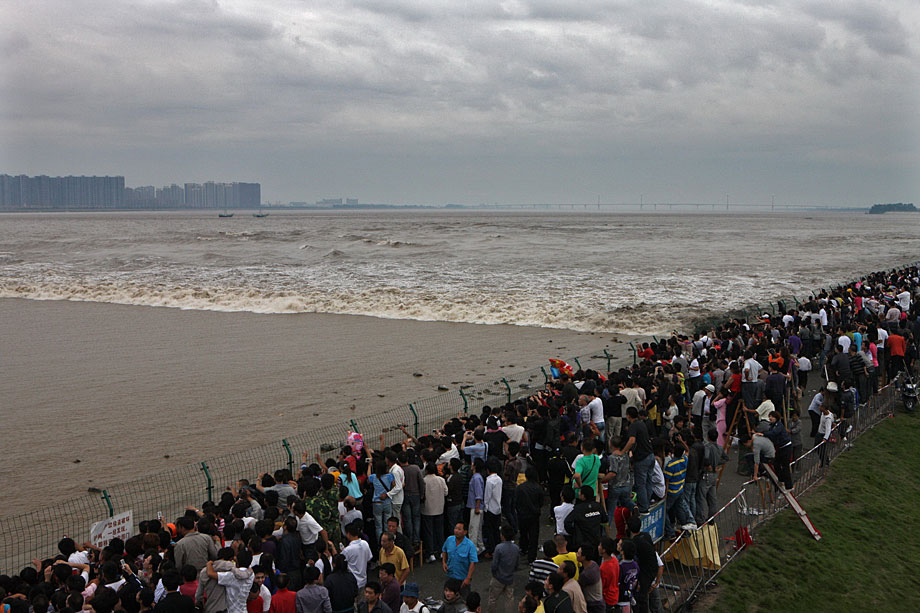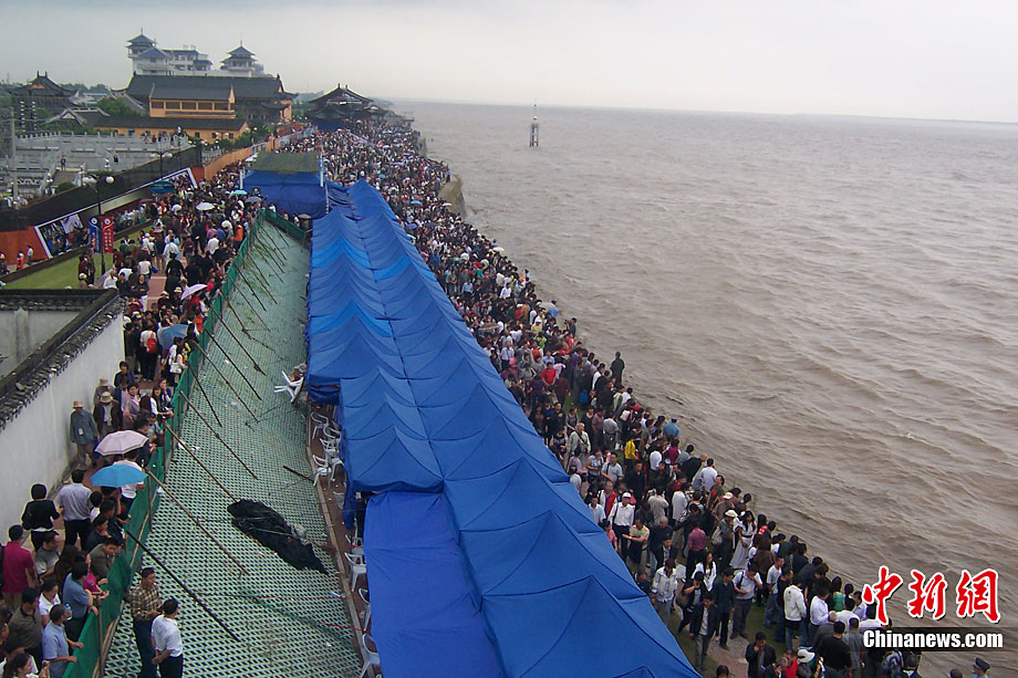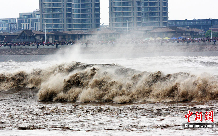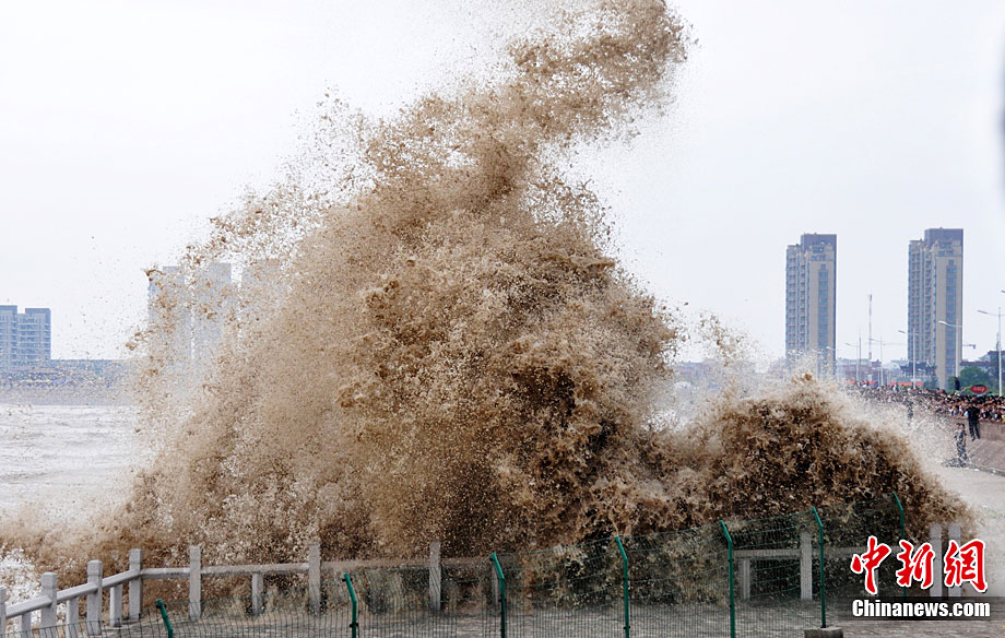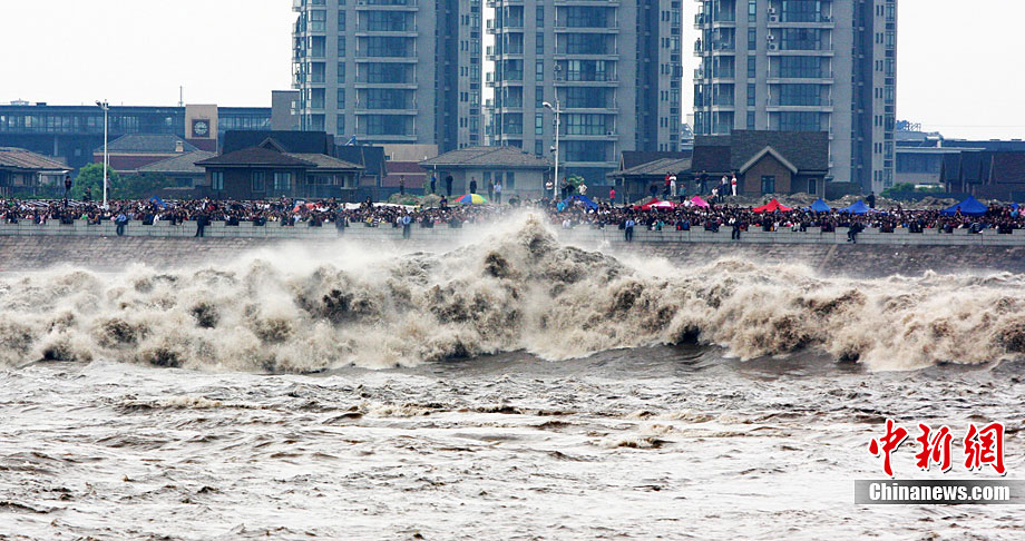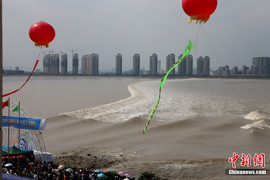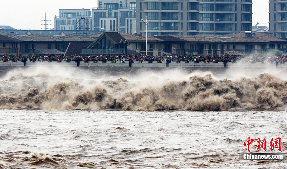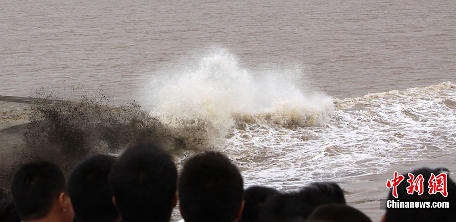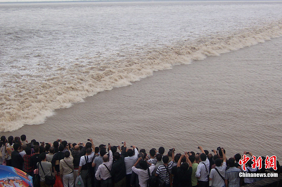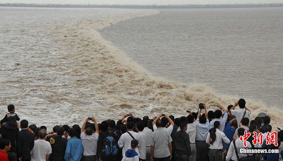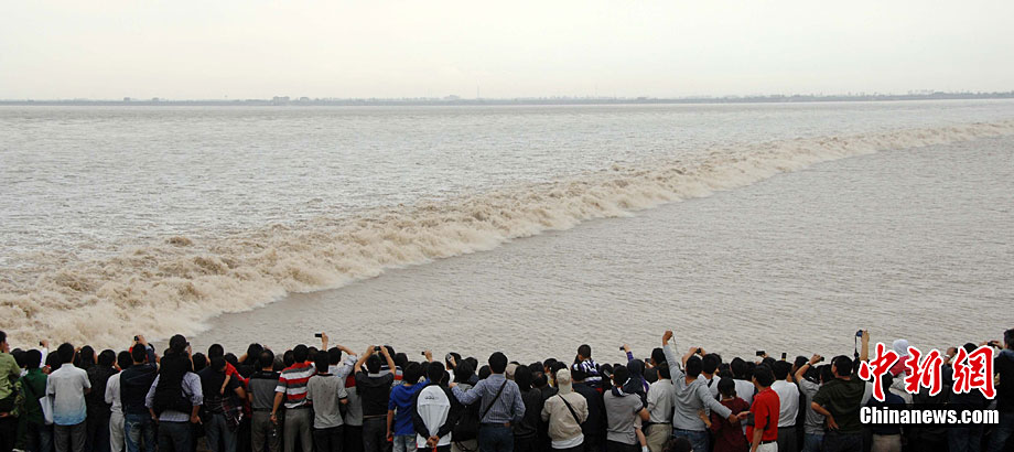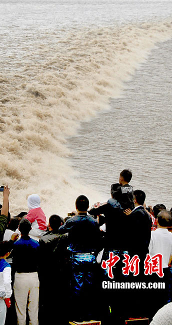 八月十八潮,壯觀天下無。9月25日12時38分,近八年最大錢塘潮如約而至抵達(dá)浙江省海寧鹽官,來自世界各地的游客爭睹“一線潮”景觀。汪恩民 攝
