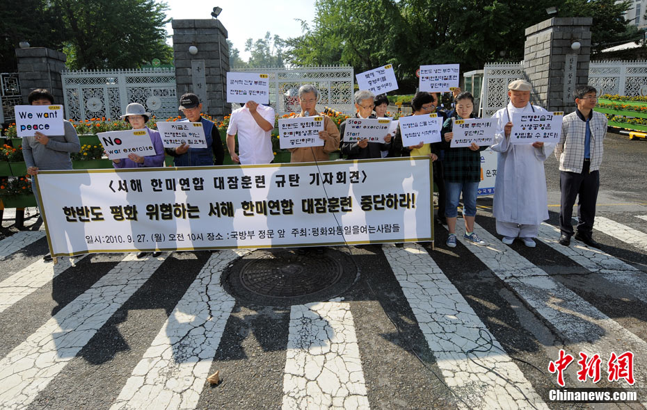 韓美反潛聯(lián)合軍事演習(xí)27日在韓國西部海域(黃海)拉開帷幕。當(dāng)日,一些韓國反戰(zhàn)人士在國防部門前集會抗議美韓聯(lián)合軍演。