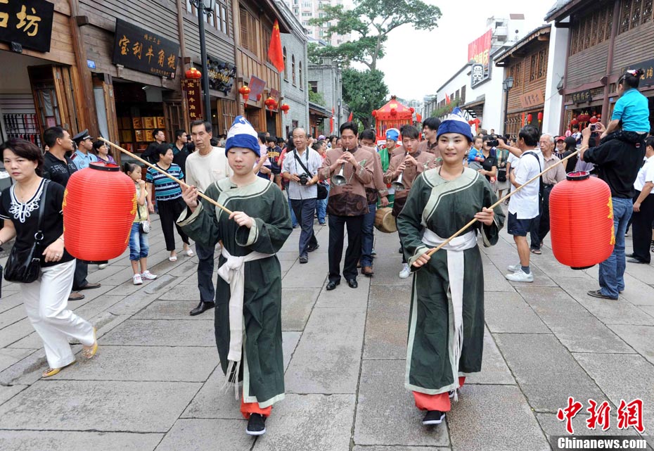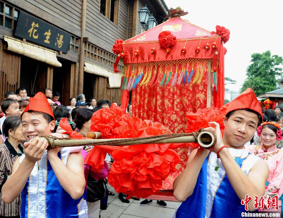 10月1日國慶節(jié),福州古街上演一場傳統(tǒng)民俗婚禮令眾多游客爭睹。該傳統(tǒng)民俗婚禮分起轎、回車馬、迎轎、下轎、祭拜天地、入洞房等場面喜慶。