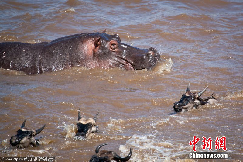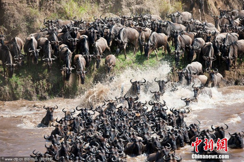 英國兄弟威廉和馬修·伯拉德-盧卡斯日前從倫敦前往非洲進(jìn)行了為期12天的探險之旅,他們在塞倫蓋蒂國家公園和馬賽馬拉國家保護(hù)區(qū)之間的馬拉河畔拍到了230萬只牛羚大遷徙的壯觀景象。馬拉河是長途遷徙的牛羚要渡過的最后一條河,在這里,牛羚的兩大天敵都在等待著它們,一種是世上最大、最為兇殘的尼羅鱷,另一種則是被稱為“非洲河王”的河馬。它們潛伏在水中,等待著牛羚渡河時飽餐一頓。而且在這種時候,就連周圍草原里的獵豹等猛獸也會來分一杯羹。但每年春秋兩季,牛羚都會從這里涉水而過,遷徙到遠(yuǎn)方尋找水草豐美的“伊甸園”。 圖片來源:CFP視覺中國
