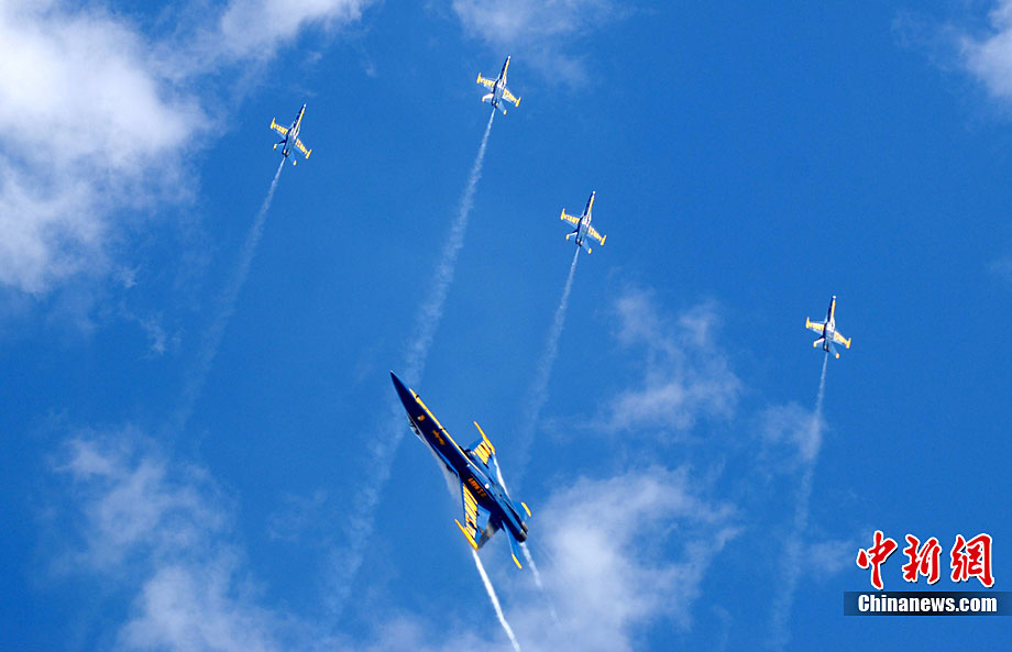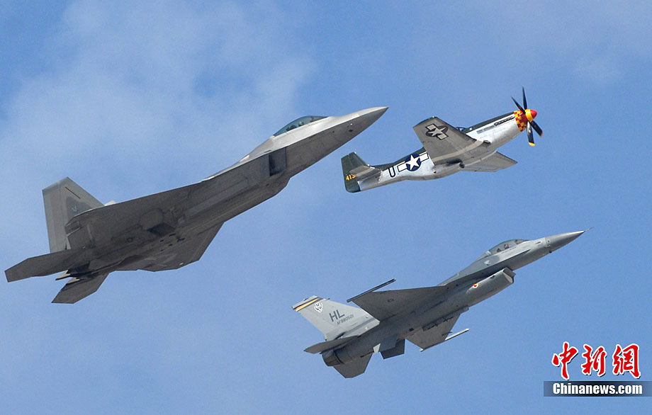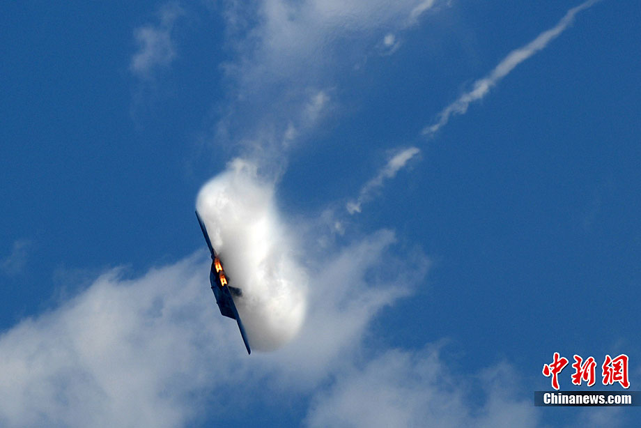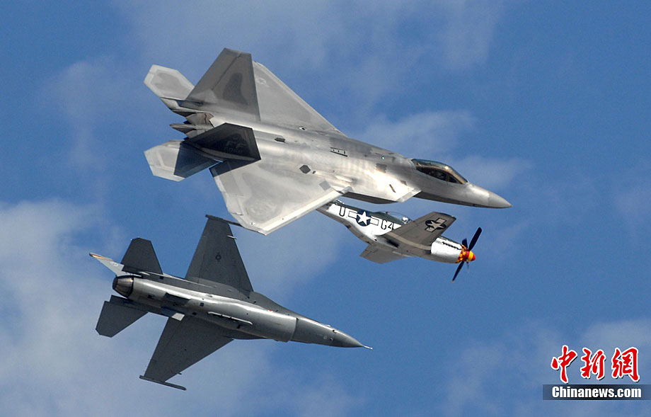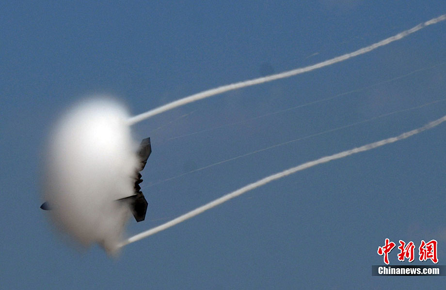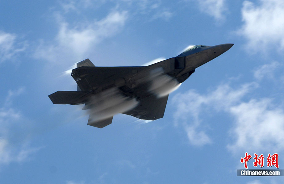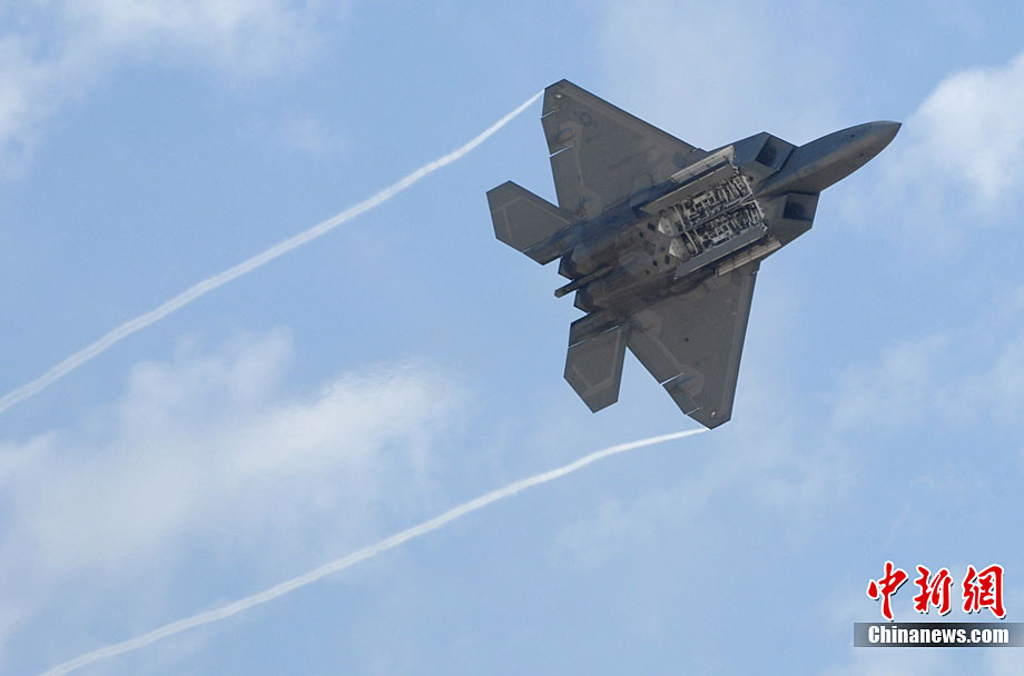 當?shù)貢r間10月3日,美國著名的密拉瑪航空展在加州密拉瑪海軍陸戰(zhàn)隊航空基地舉行。三天的航空展示和飛行表演吸引了近70萬人次參觀。圖為美軍最先進的F-22猛禽戰(zhàn)機空中英姿。中新社發(fā) 張煒 攝