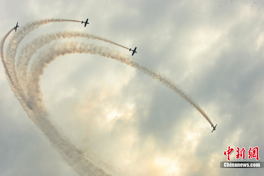 中新網(wǎng)大足10月4日電 (連肖 杜遠(yuǎn))4日下午,重慶大足首屆國際航空體育旅游節(jié)開幕,空軍“八一”跳傘隊(duì)和英國兩支特技飛行隊(duì)在大足龍水湖上空上演了多項(xiàng)空中特技。其中,兩名英國女郎站在時(shí)速高達(dá)240公里的飛機(jī)機(jī)翼上表演各種芭蕾動(dòng)作,引得觀眾大呼驚險(xiǎn)。連肖 攝