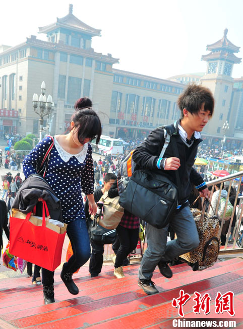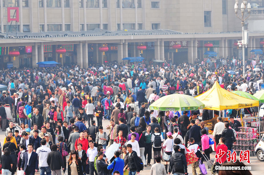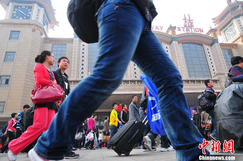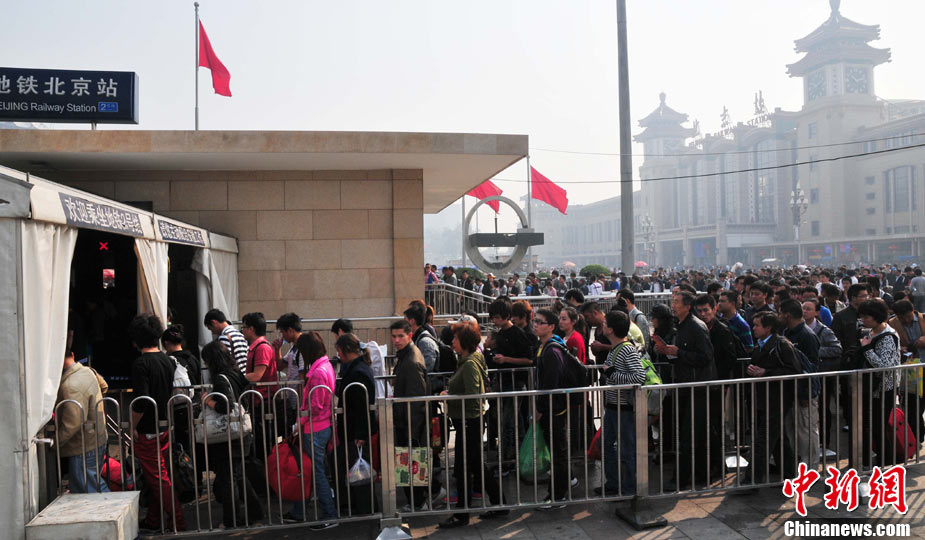 2010年10月6日,國(guó)慶“十一”黃金周長(zhǎng)假即將結(jié)束,北京站、北京西站迎來(lái)返程客流高峰。樊甲山 攝 圖片來(lái)源:CFP視覺中國(guó)