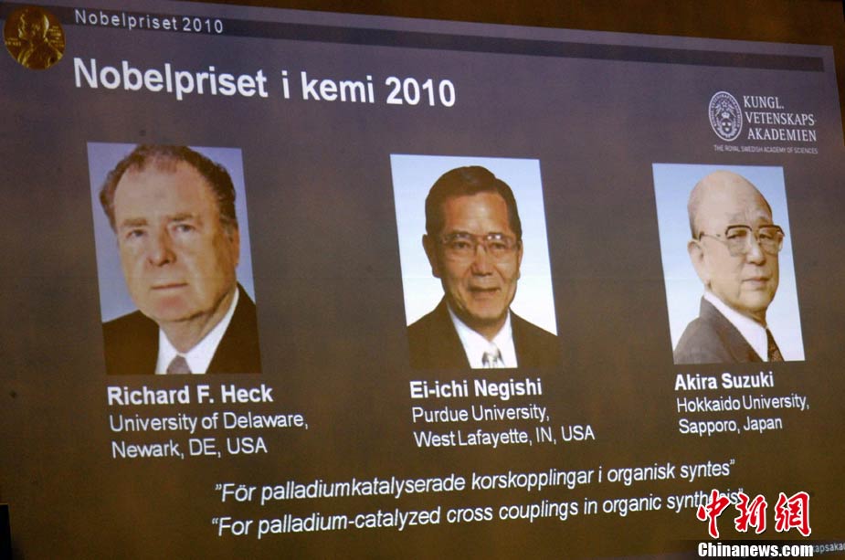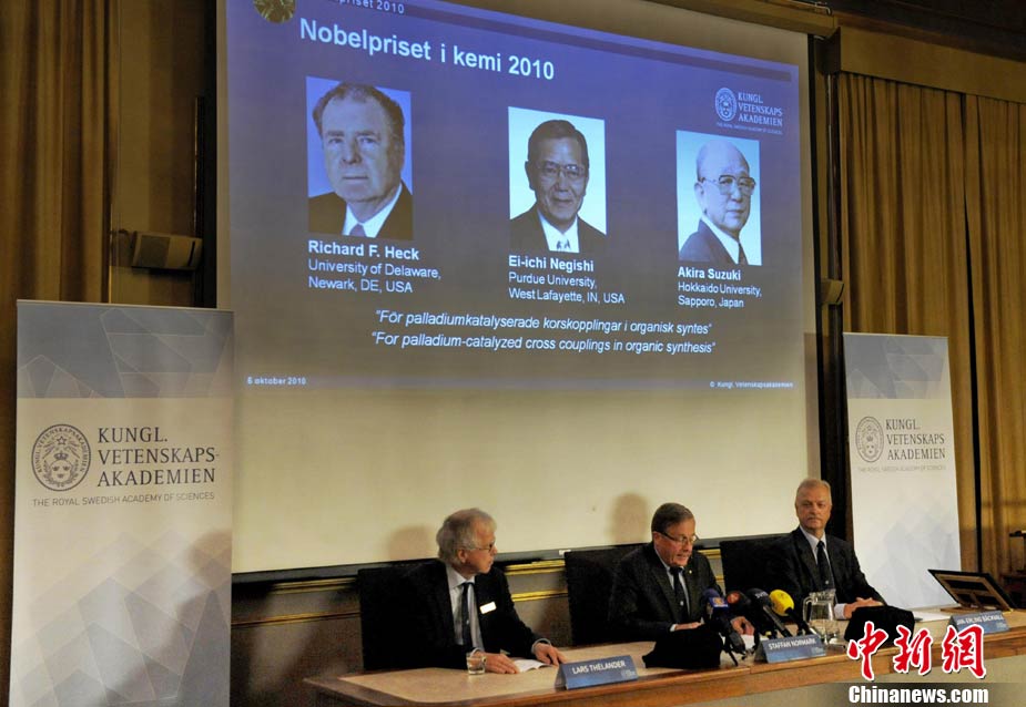 當?shù)貢r間10月6日,瑞典皇家科學院宣布將2010年諾貝爾化學獎授予美國科學家理查德-赫克、日本科學家根岸榮一和鈴木章。