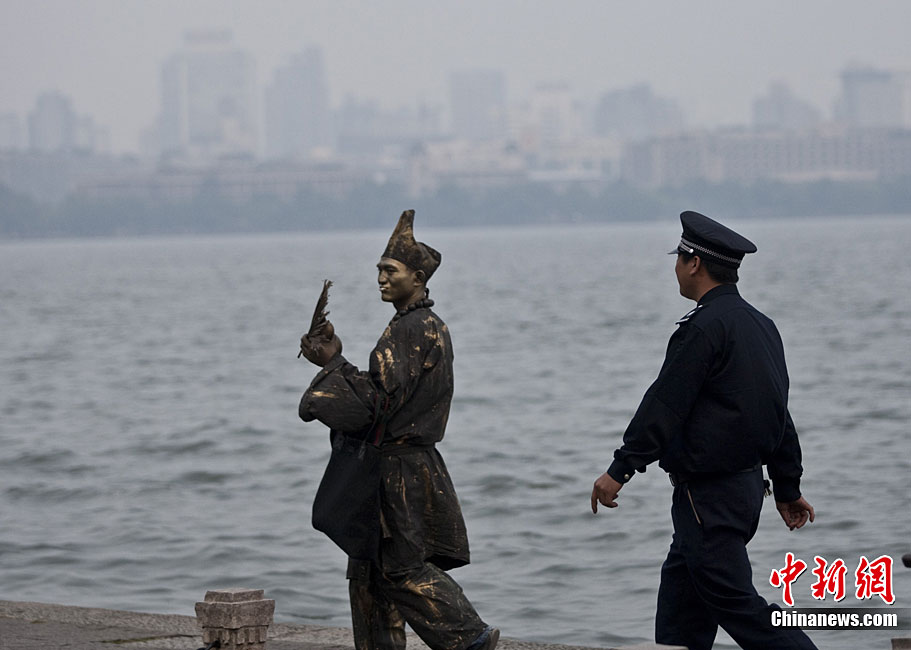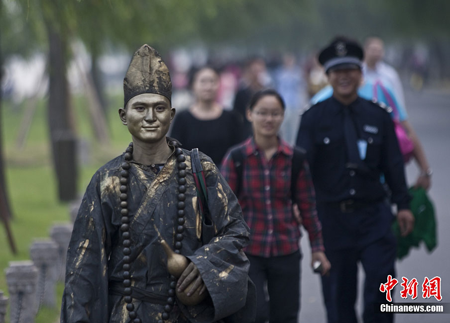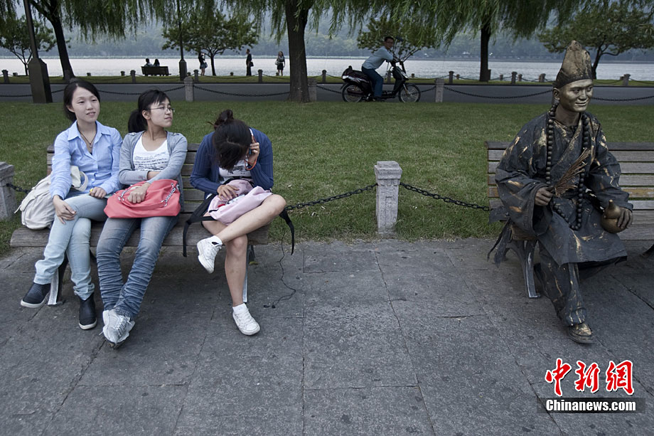 2010年10月上旬,一名打扮成濟(jì)公模樣的人在浙江省杭州市西湖白堤和游客合影,“濟(jì)公”身上涂滿了銅顏色的彩繪,看上去像雕塑一樣。據(jù)悉,這位20多歲“濟(jì)公”來(lái)自江蘇,從今年春天開(kāi)始扮成“濟(jì)公”,在全國(guó)游走。和他合影需要交5元錢(qián)。許康平 攝 圖片來(lái)源:cnsphoto