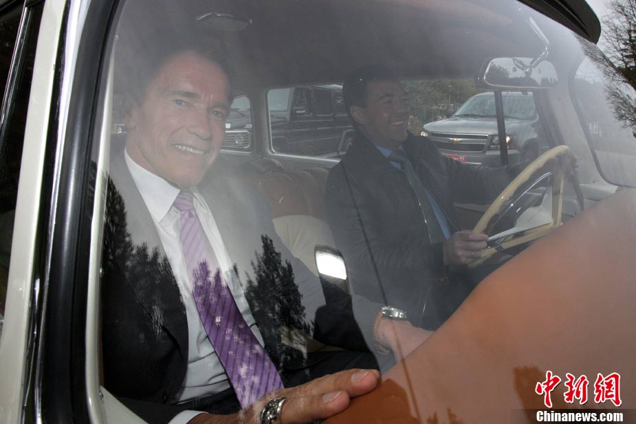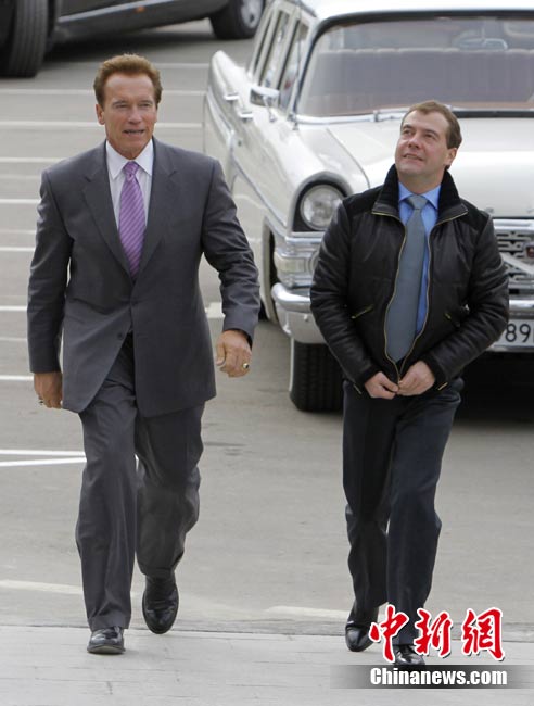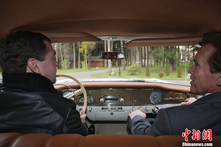 10月11日,莫斯科,美國(guó)加州州長(zhǎng)施瓦辛格訪問(wèn)俄羅斯,與俄羅斯總統(tǒng)梅德韋杰夫會(huì)面。梅德韋杰夫總統(tǒng)還為施瓦辛格客串了一把“司機(jī)!