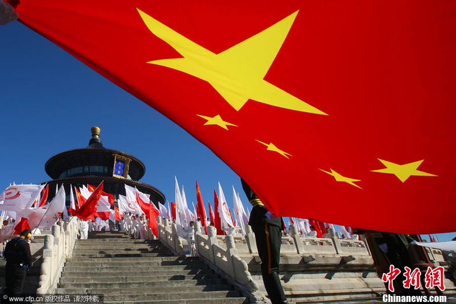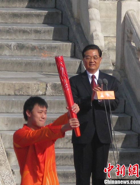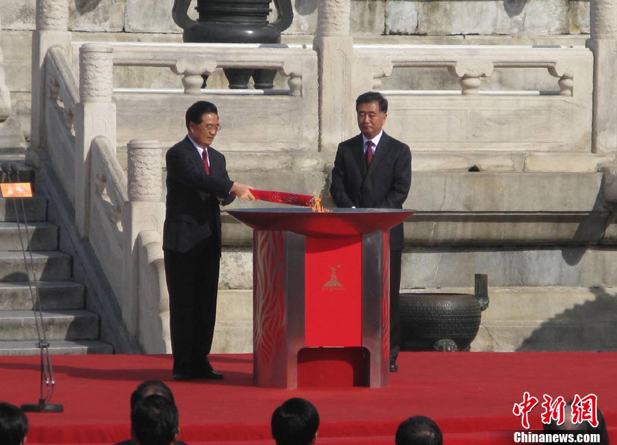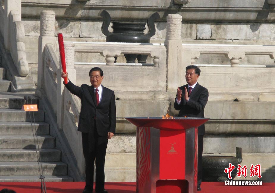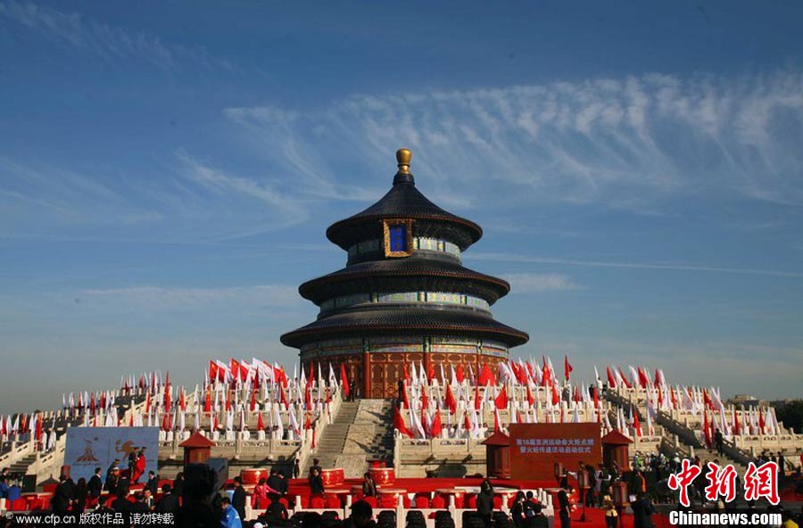 10月12日上午,廣州亞運(yùn)會(huì)火炬點(diǎn)燃暨傳遞啟動(dòng)儀式在北京天壇祈年殿南廣場(chǎng)舉行。10點(diǎn)17分,中共中央總書記、國家主席胡錦濤點(diǎn)燃主火炬。 中新社記者 沈晨 攝