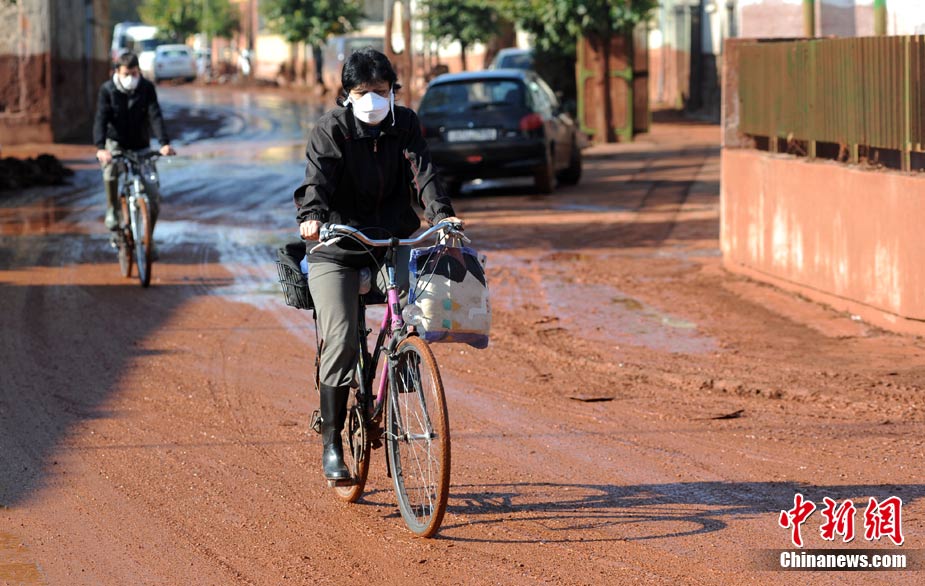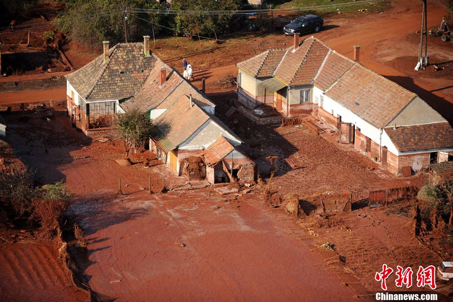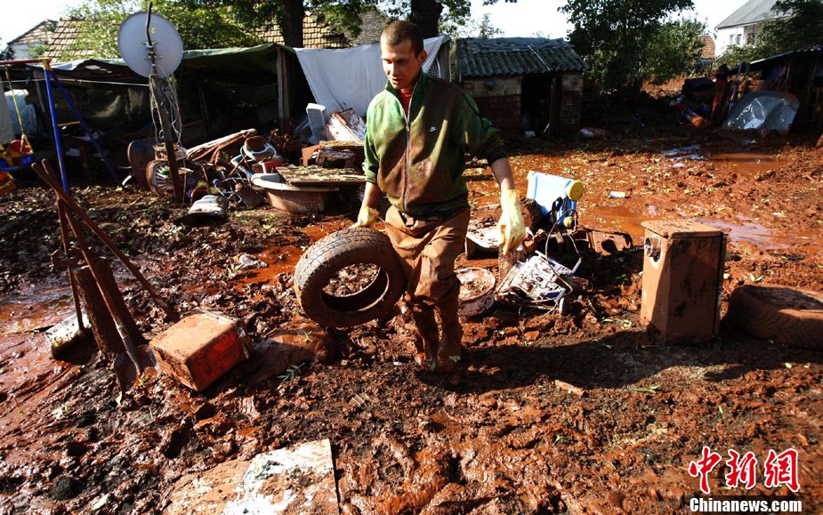 10月12日,匈牙利有毒廢料已擴散到河道兩岸以及居民區(qū)。截至目前,基于 “二次泄漏”的威脅,污染最嚴(yán)重的科隆塔爾鎮(zhèn)中已有近1000人被迫離開自己的家園。圖為居民經(jīng)過被污染的路面。