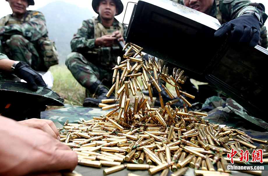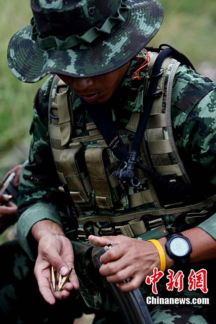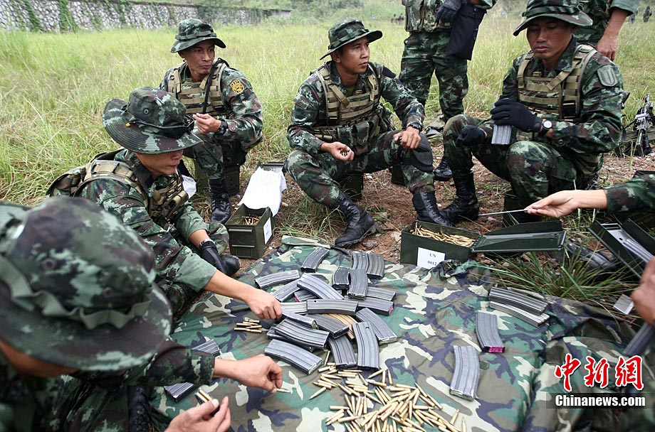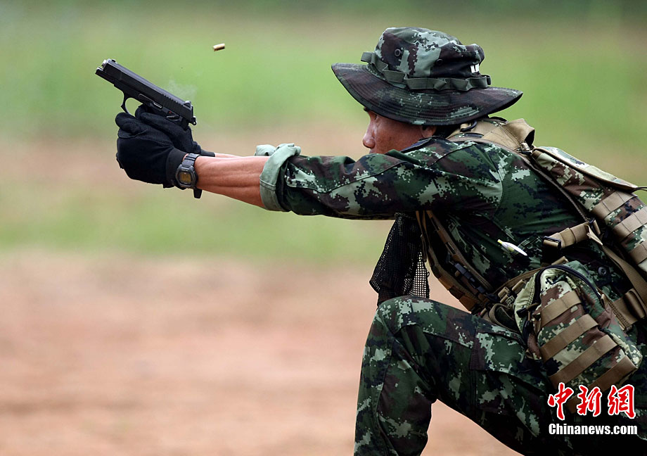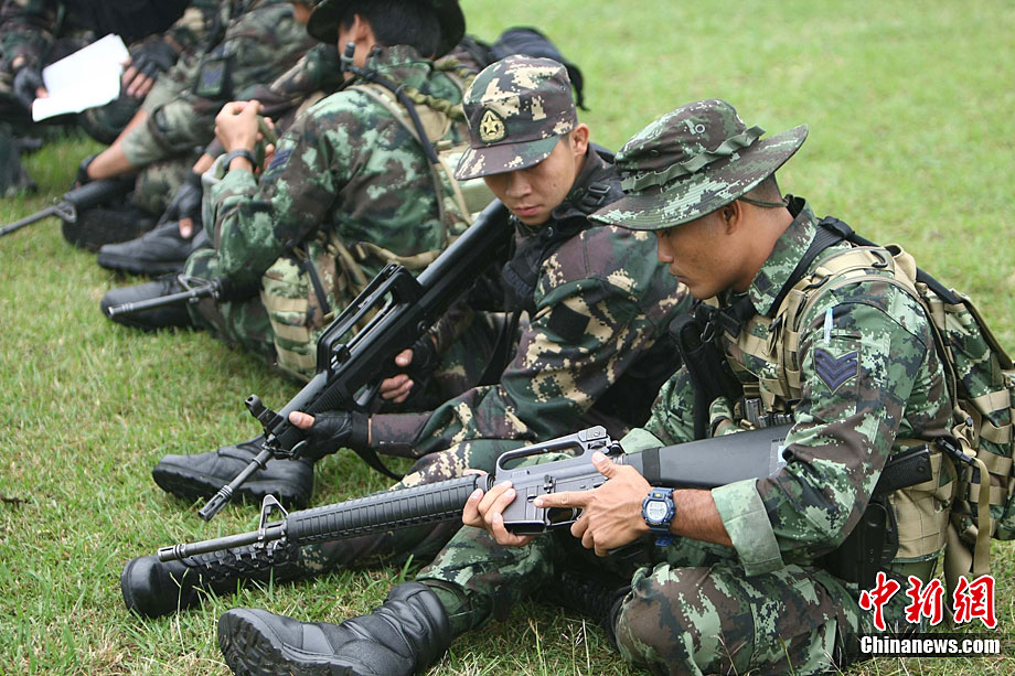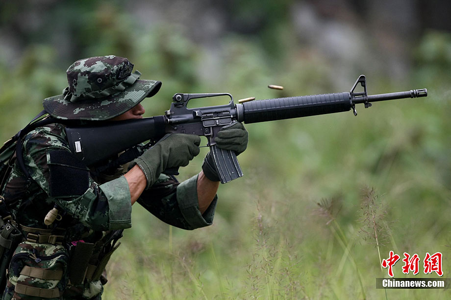 “突擊-2010”中泰陸軍特種部隊反恐聯(lián)合訓練10月6日至20日在廣西壯族自治區(qū)桂林進行。中泰雙方將各派出60余人的特種分隊參加訓練。此次聯(lián)合訓練分展示交流、混編同訓和綜合演練三個階段,主要圍繞城市反恐基礎(chǔ)技能訓練、混編分隊戰(zhàn)術(shù)訓練等科目進行。圖為泰方隊員M16步槍實彈速射。中新社記者 杜洋 攝