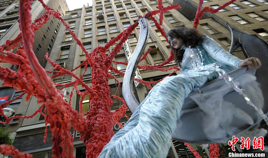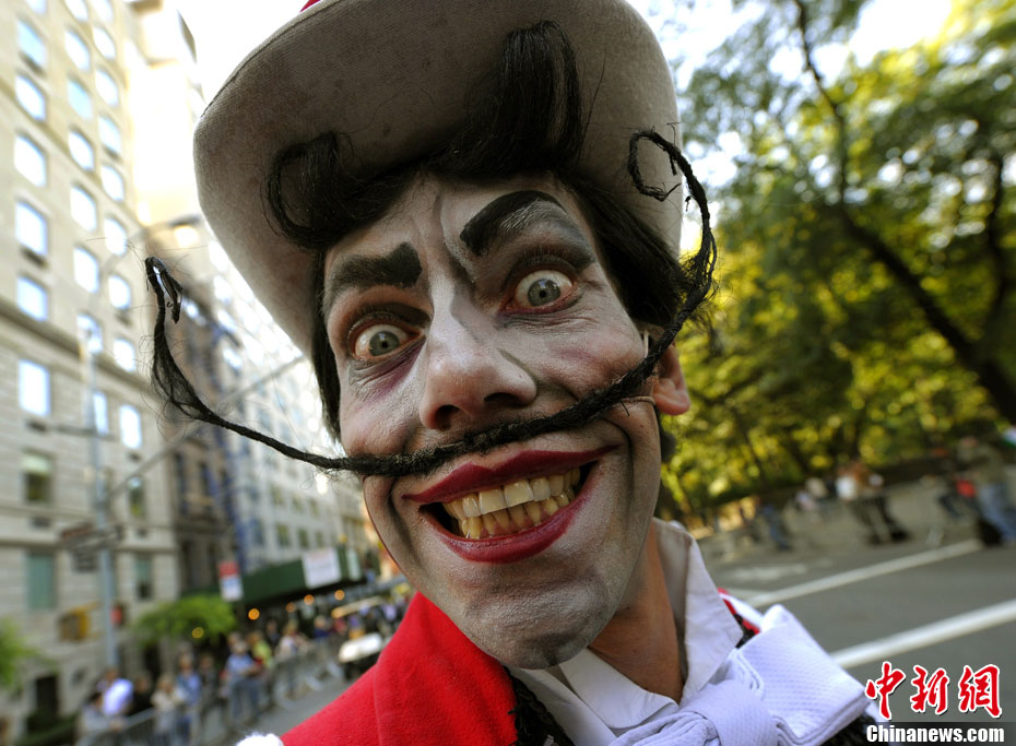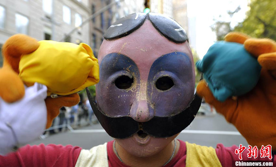 來(lái)自意大利劇木偶奇遇記的劇成員在紐約曼哈頓第五大道進(jìn)行街頭表演。