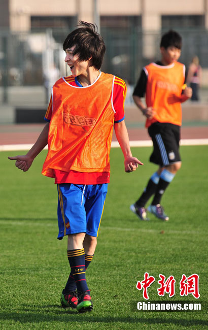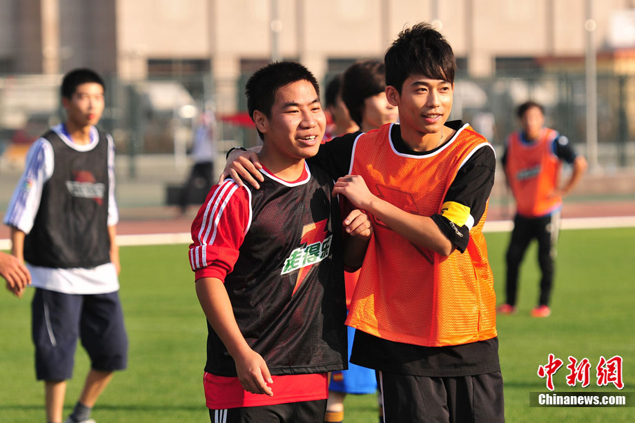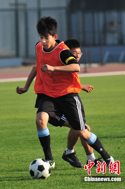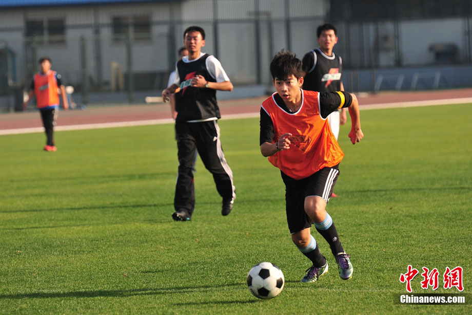 10月13日,“青春綻放”大學生音樂之旅大賽走進北京大學舉行宣傳活動。蘇醒、王嘯坤、王錚亮等潮流歌手組成明星足球隊,與北大學子們在綠茵場上切磋球技,揮灑青春熱情。據悉,“青春綻放”大學生音樂之旅大型音樂人才選拔活動已進入高校宣傳階段,將陸續(xù)走進清華大學,首都師范大學,中央民族大學等十多所高校,鼓勵更多的大學生參賽,展現青春自我。圖為蘇醒帶球突破。中新社記者 李學仕 攝
