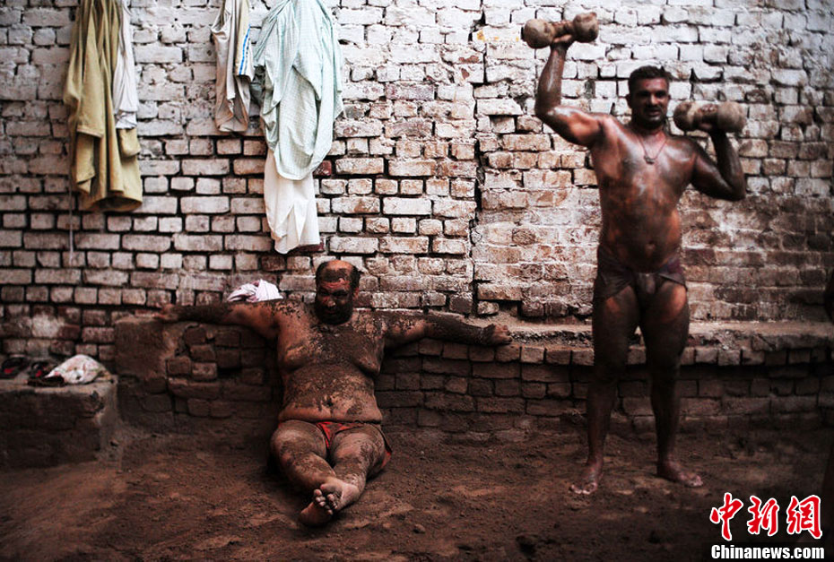 圖為巴基斯坦泥地摔跤手的訓(xùn)練生活。