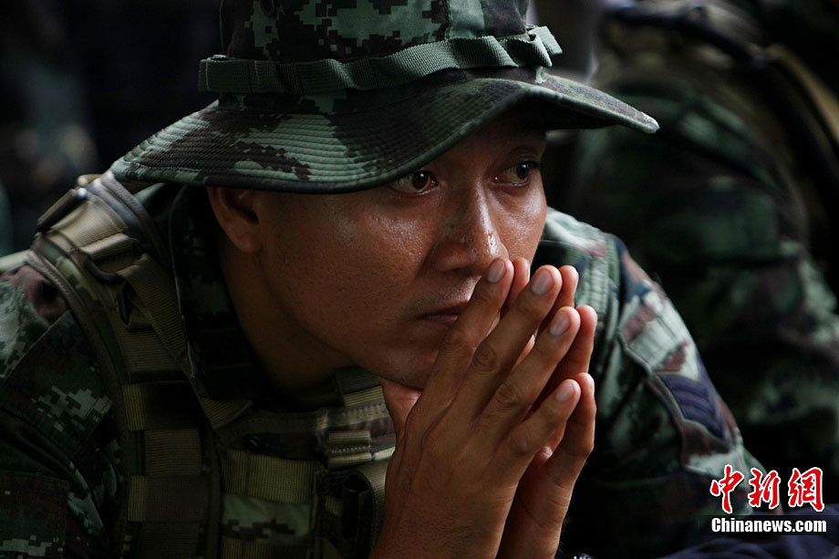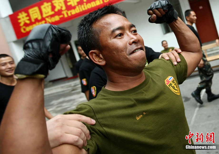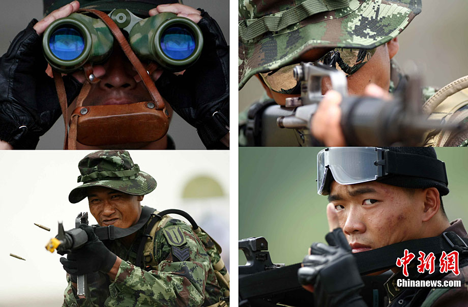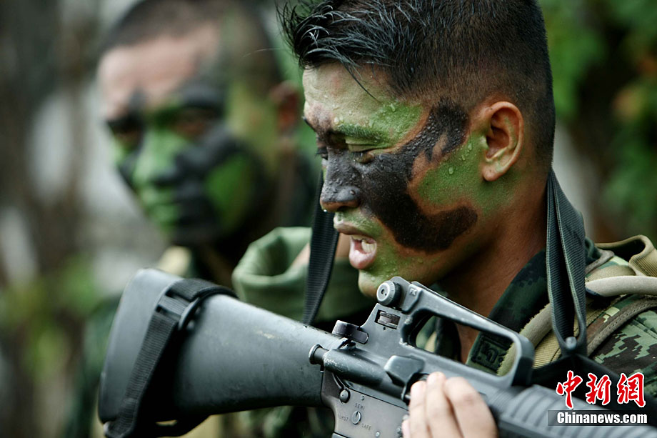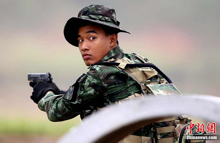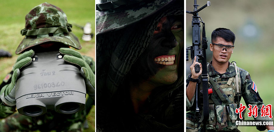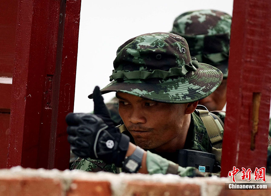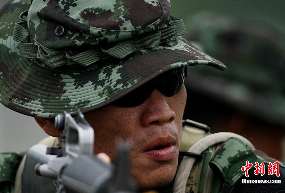 10月6日至20日,代號“突擊—2010”的中泰陸軍特種部隊聯(lián)合反恐訓(xùn)練在廣西桂林舉行。參加演練的,分別是被譽為“南國利劍”的廣州軍區(qū)某特種大隊和被譽為“叢林猛虎”的泰國陸軍特戰(zhàn)三團派出的120名官兵。在兩周時間內(nèi),訓(xùn)練內(nèi)容涵蓋射擊、攀登、反制戰(zhàn)術(shù)等8大項、20多個小項的課目。中新社記者 杜洋 攝