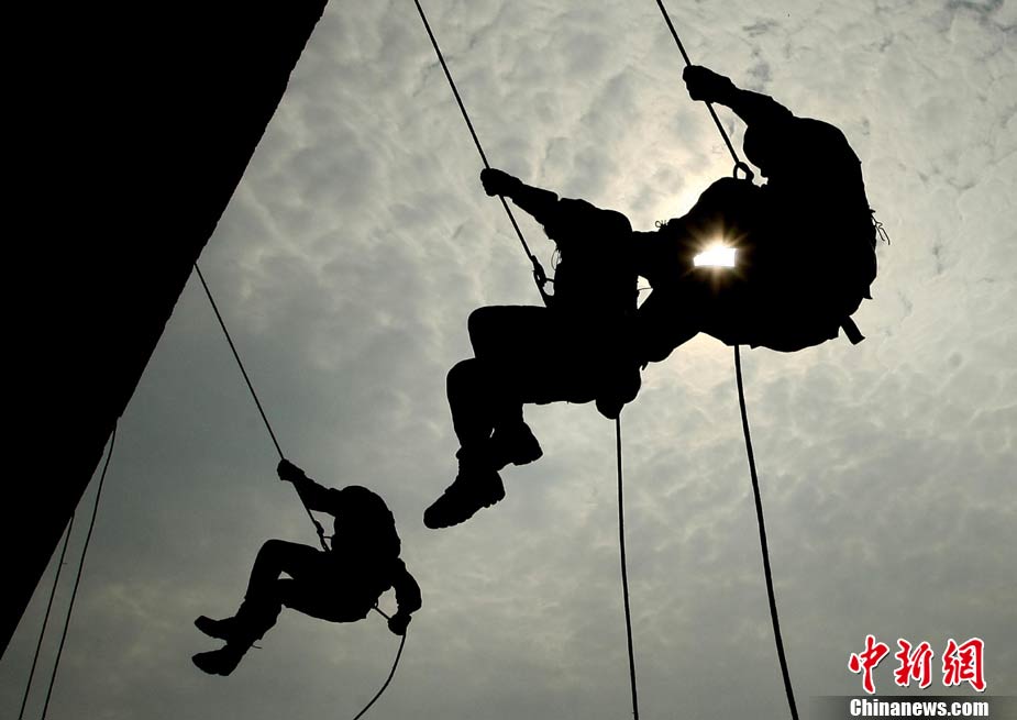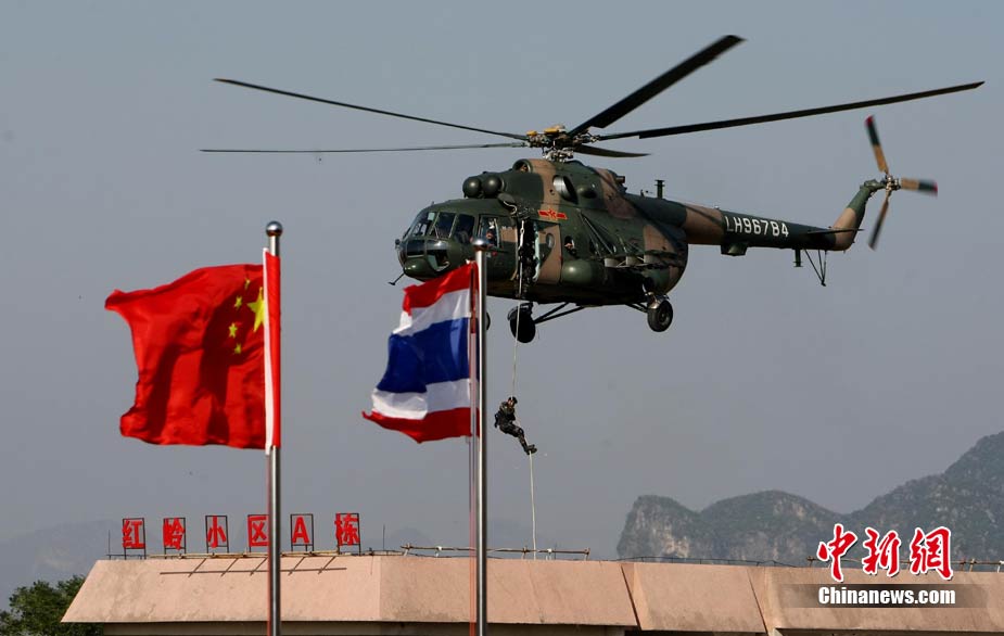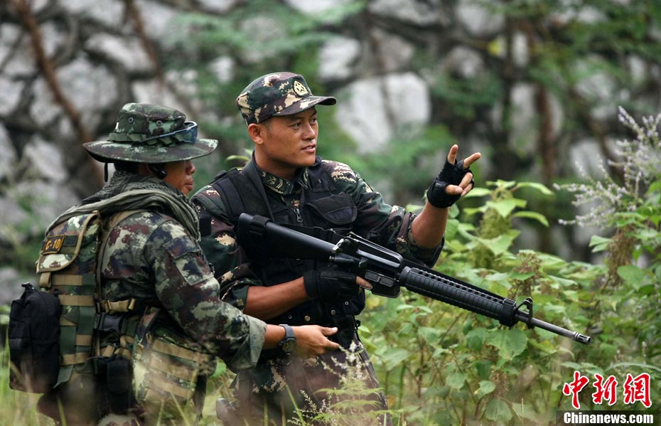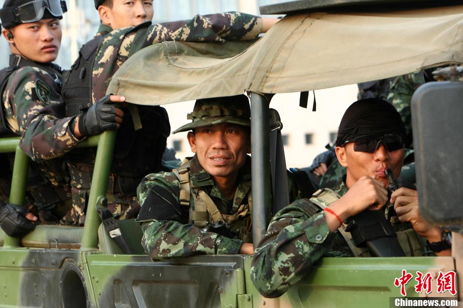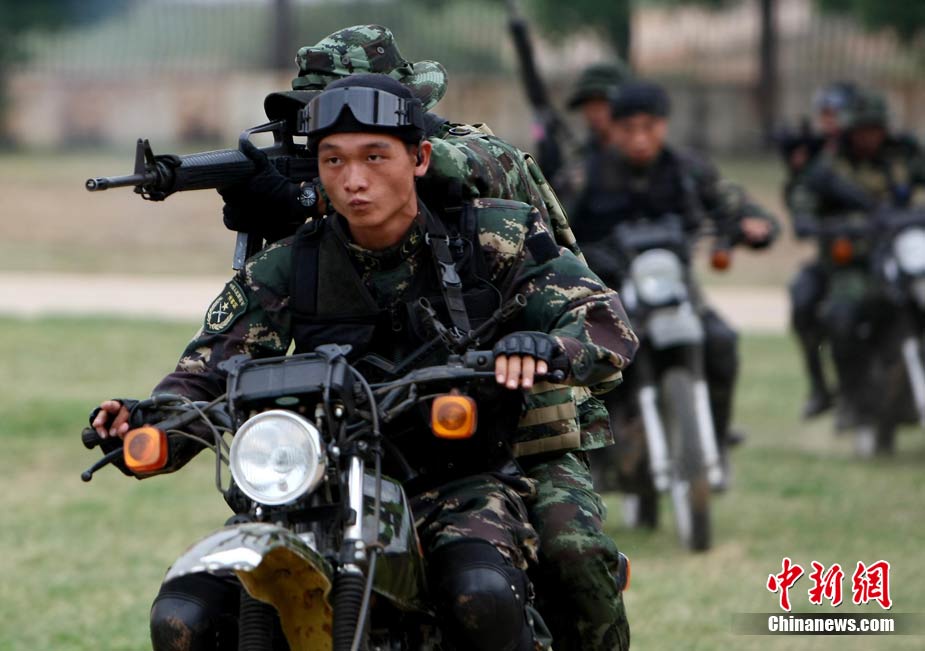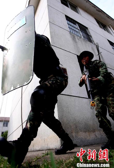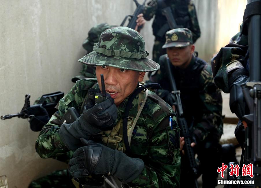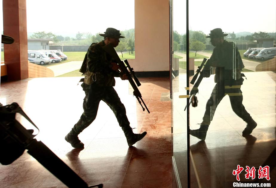 10月19日,“突擊-2010”中泰反恐聯(lián)訓(xùn)在廣州軍區(qū)“紅嶺”合同戰(zhàn)術(shù)訓(xùn)練基地舉行“獵鼬”行動(dòng)實(shí)兵綜合演練,圍繞“城市聯(lián)合反恐行動(dòng)”這一課題,演練了快速封鎖、偵搜排查、隔離疏散、立體突擊4個(gè)行動(dòng)。演練模擬一名為“臭鼬”的國(guó)際恐怖組織在泰國(guó)制造暴力恐怖活動(dòng)后,秘密潛入中國(guó)G市紅嶺小區(qū),企圖在XX地區(qū)領(lǐng)導(dǎo)人峰會(huì)期間繼續(xù)制造恐怖事件,干擾峰會(huì)順利進(jìn)行。中泰兩國(guó)政府依據(jù)聯(lián)合反恐協(xié)議,決定成立聯(lián)合指揮機(jī)構(gòu),抽調(diào)特種部隊(duì)精銳力量組成“獵鼬突擊隊(duì)”,共同進(jìn)行反恐作戰(zhàn)任務(wù)。 中新社記者 杜洋 攝