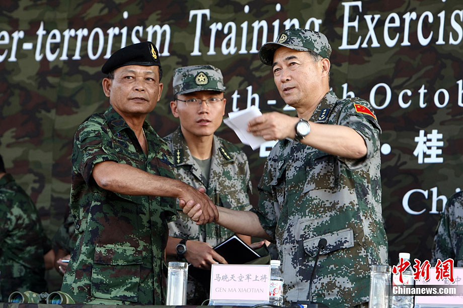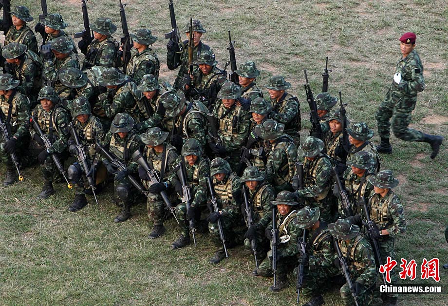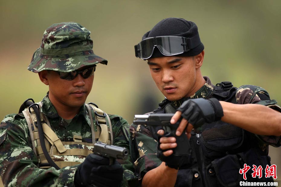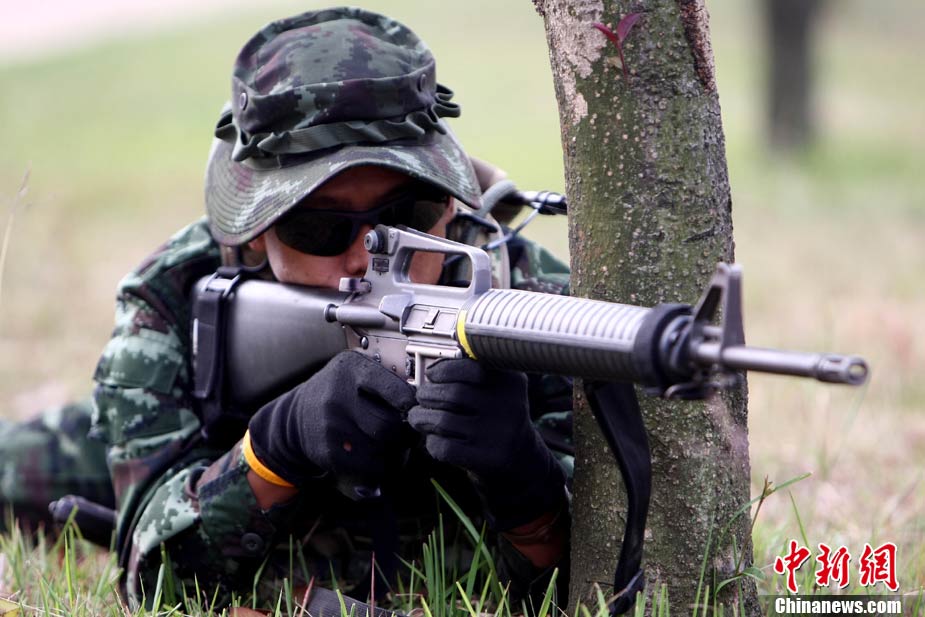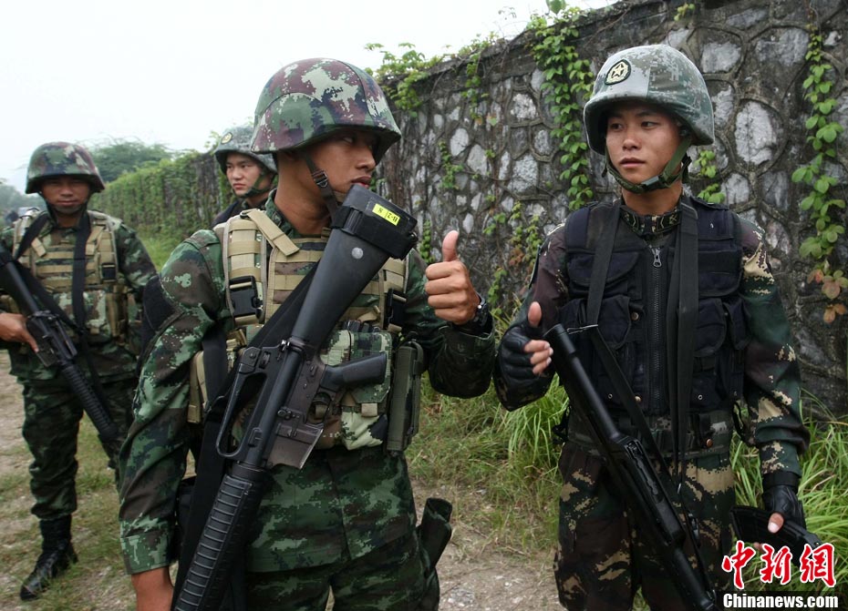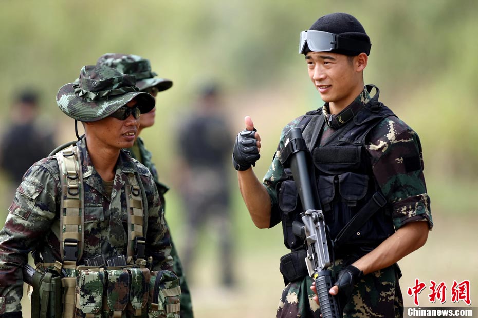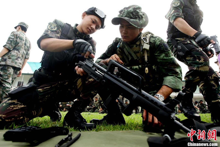 10月19日,“突擊-2010”中泰反恐聯(lián)訓(xùn)在廣州軍區(qū)“紅嶺”合同戰(zhàn)術(shù)訓(xùn)練基地舉行“獵鼬”行動(dòng)實(shí)兵綜合演練,圍繞“城市聯(lián)合反恐行動(dòng)”這一課題,演練了快速封鎖、偵搜排查、隔離疏散、立體突擊4個(gè)行動(dòng)。演練模擬一名為“臭鼬”的國(guó)際恐怖組織在泰國(guó)制造暴力恐怖活動(dòng)后,秘密潛入中國(guó)G市紅嶺小區(qū),企圖在XX地區(qū)領(lǐng)導(dǎo)人峰會(huì)期間繼續(xù)制造恐怖事件,干擾峰會(huì)順利進(jìn)行。中泰兩國(guó)政府依據(jù)聯(lián)合反恐協(xié)議,決定成立聯(lián)合指揮機(jī)構(gòu),抽調(diào)特種部隊(duì)精銳力量組成“獵鼬突擊隊(duì)”,共同進(jìn)行反恐作戰(zhàn)任務(wù)。 中新社記者 杜洋 攝