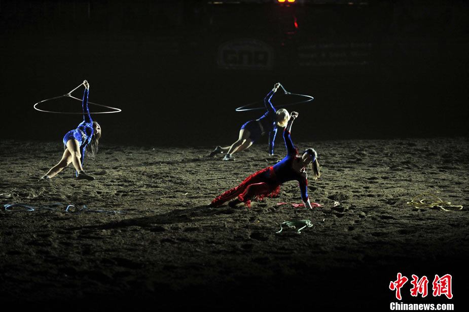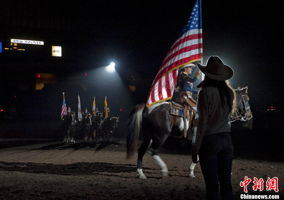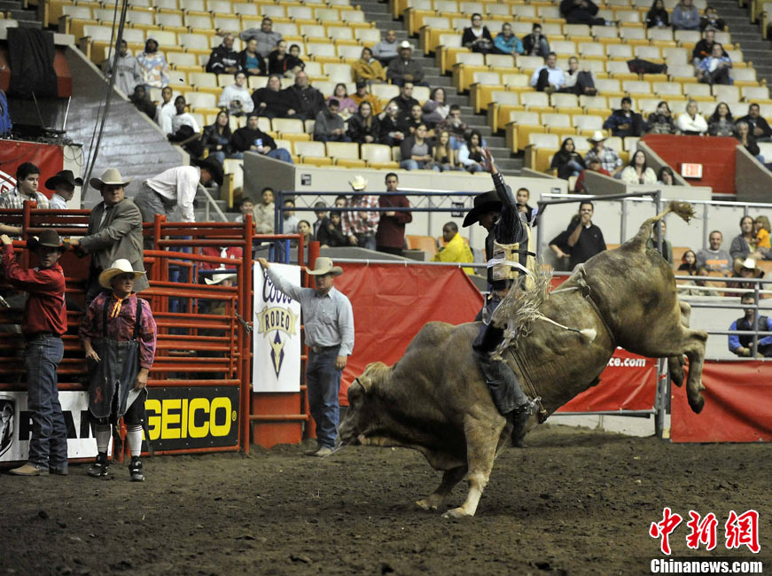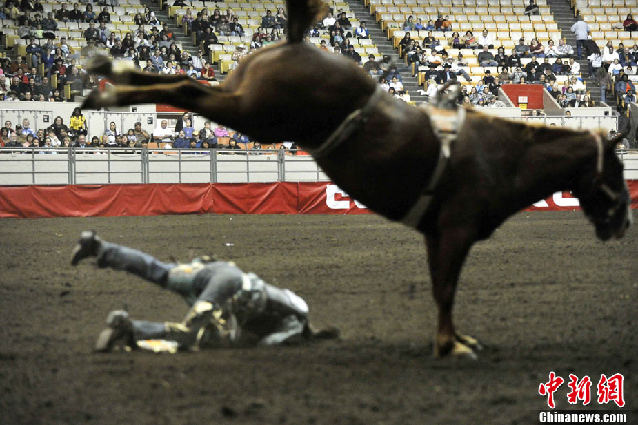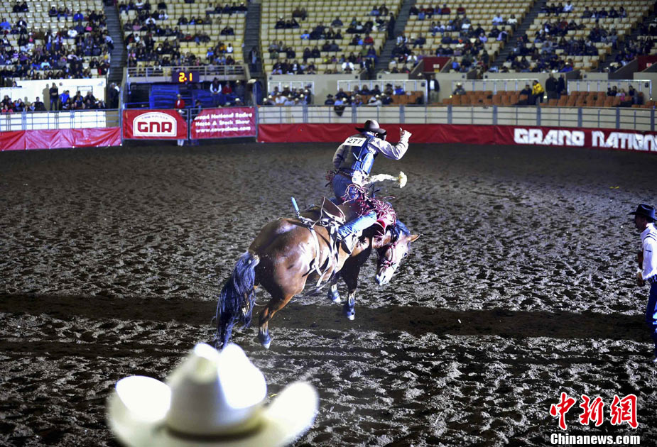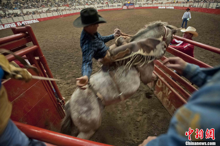 為期四日的全美騎術(shù)大會在舊金山的牛宮(Cow Palace)舉行。來自全美多個(gè)州的專業(yè)和草根牛仔參加表演,舉辦者預(yù)測將會吸引兩萬名左右的觀眾前來參觀。舊金山的全美騎術(shù)大會始于1941年,是全美專業(yè)騎術(shù)大會的前奏。圖為一名牛仔在努力馴服烈馬。中新社發(fā) 陳鋼 攝