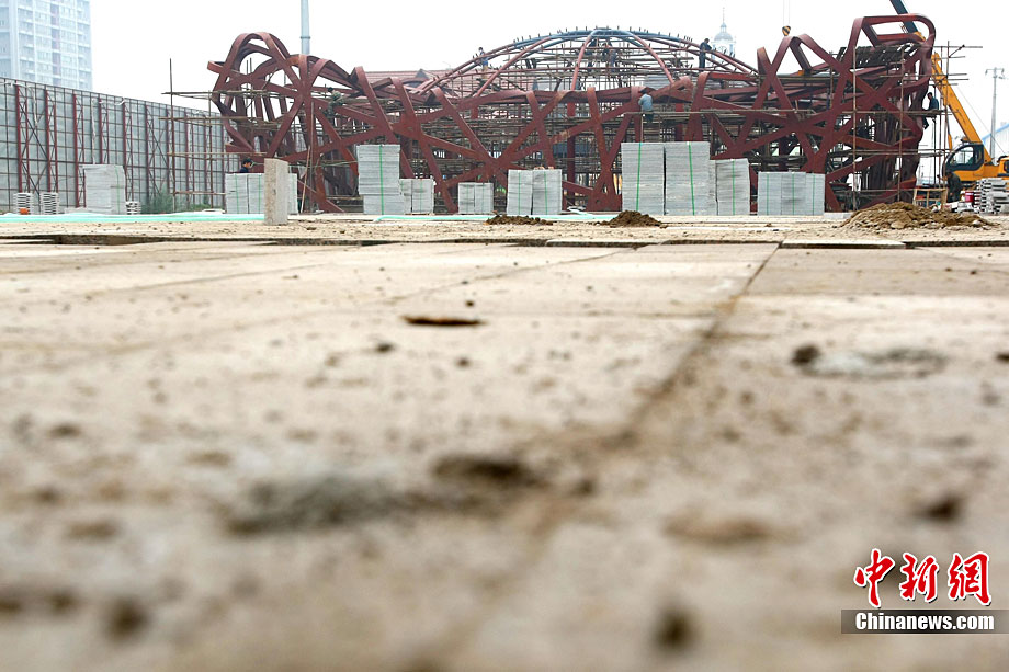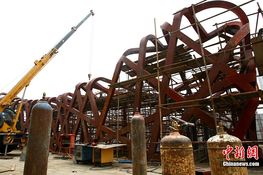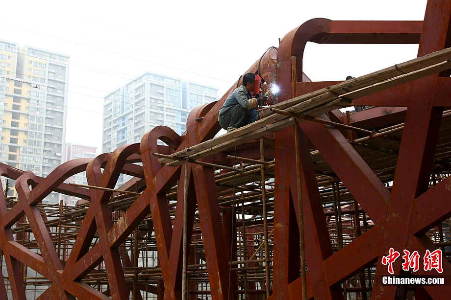 近日,北京通惠河南岸的慶豐公園東側,一座面積約300平方米、三層樓高的建筑,以其酷似國家體育場“鳥巢”的造型吸引了不少人的目光。據悉,該建筑是正在建設中的通惠時尚國際廣場的配套建筑。10月20日上午,國家體育場的工作人員已到現場取證,將研判是否涉嫌侵權。中新社記者 富田 攝