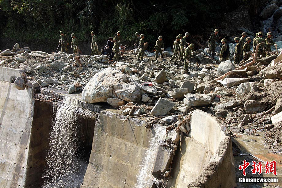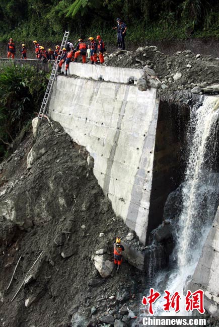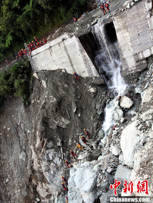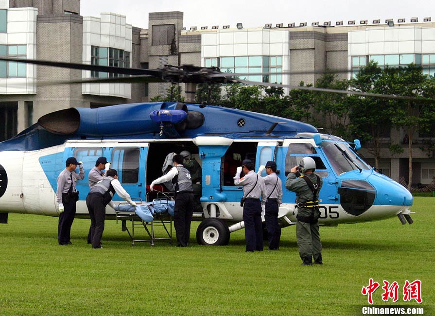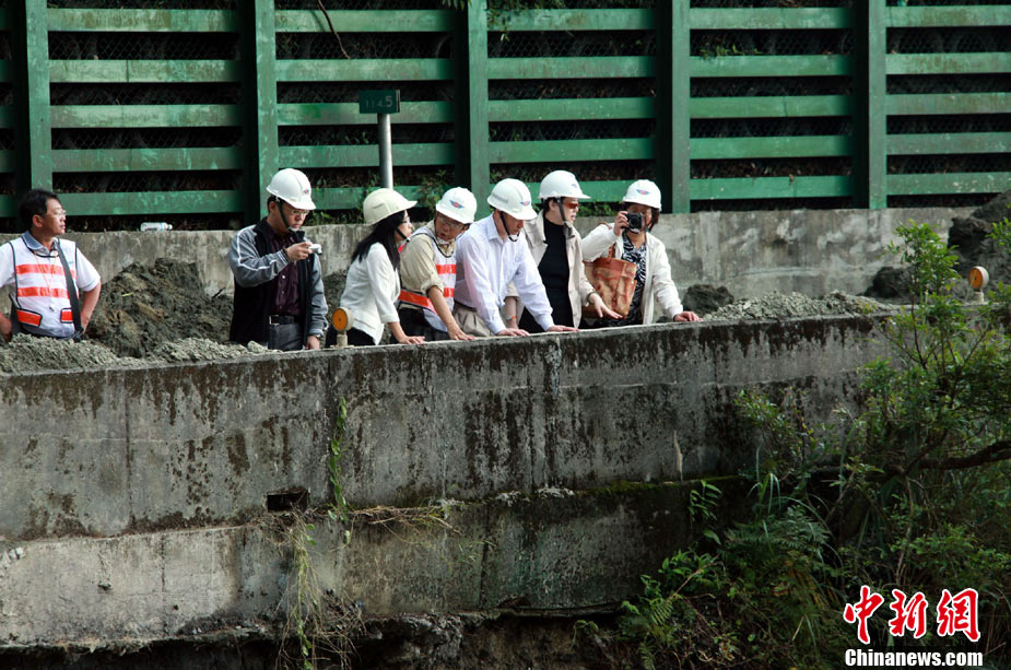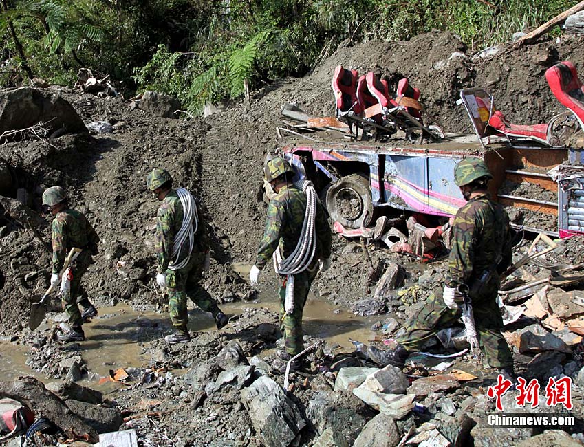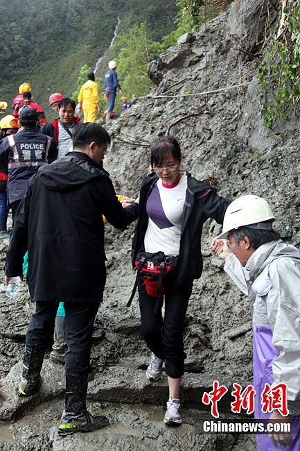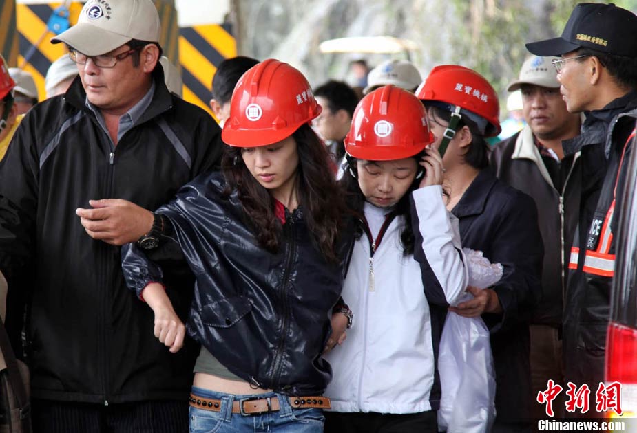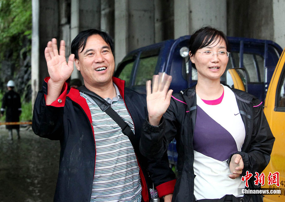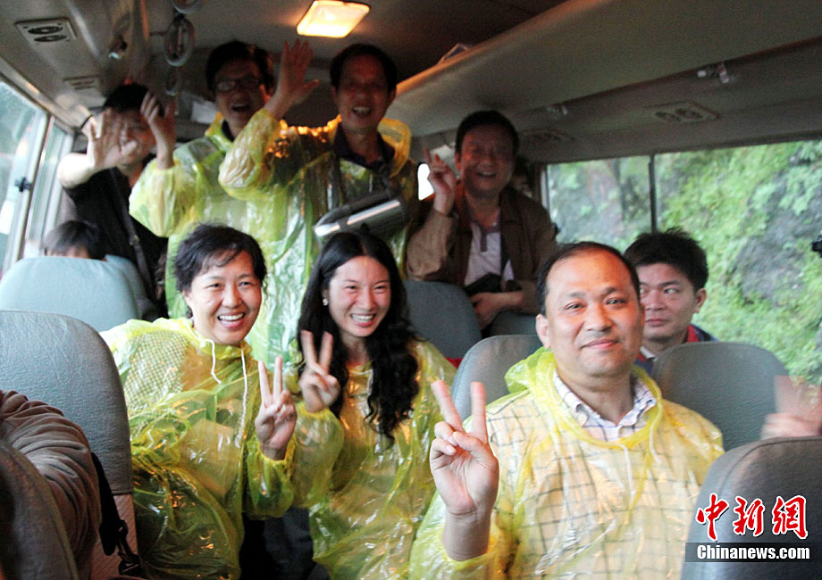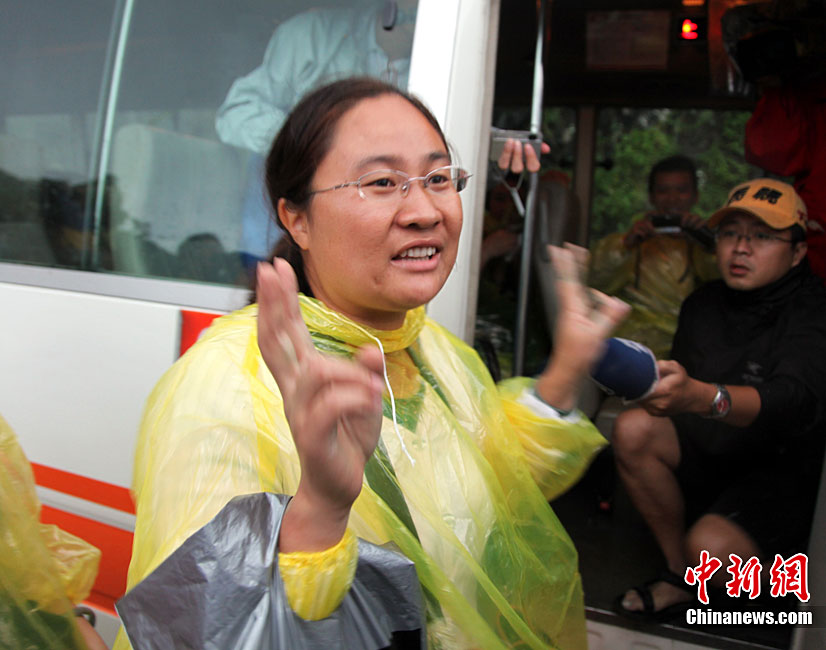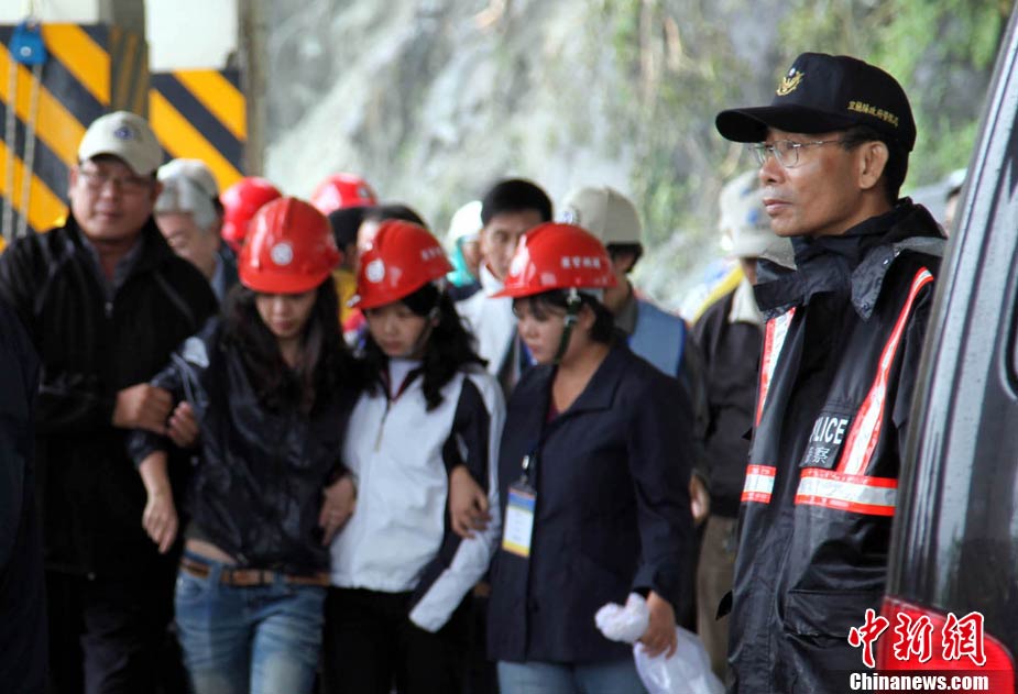 10月22日,21日因受豪雨引起的塌方困在臺灣蘇花公路的200多名大陸游客,今天有部分已脫險。圖為從蘇花公路陸路救援現(xiàn)場脫險的大陸游客團。中新社記者 陳立宇 攝