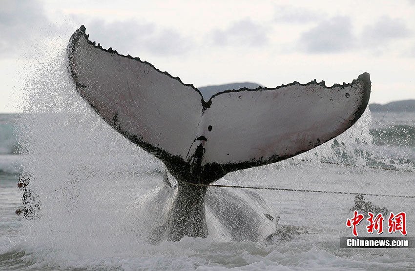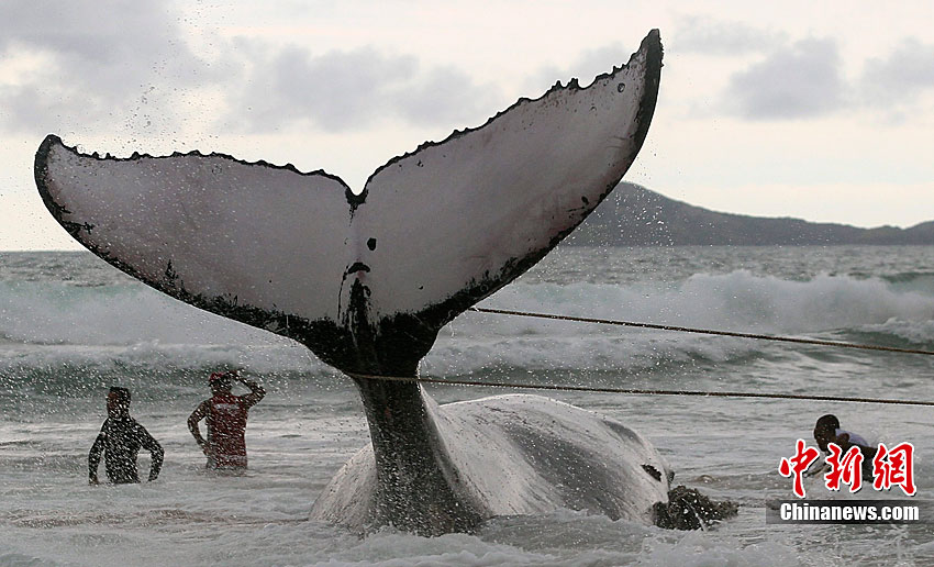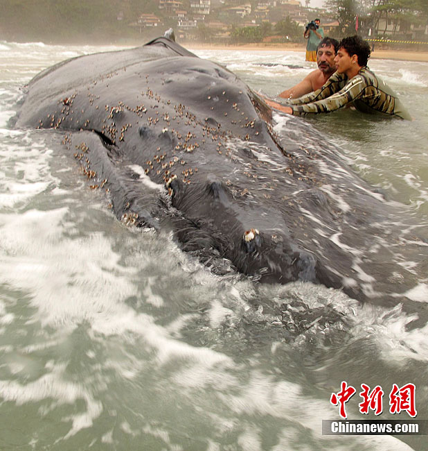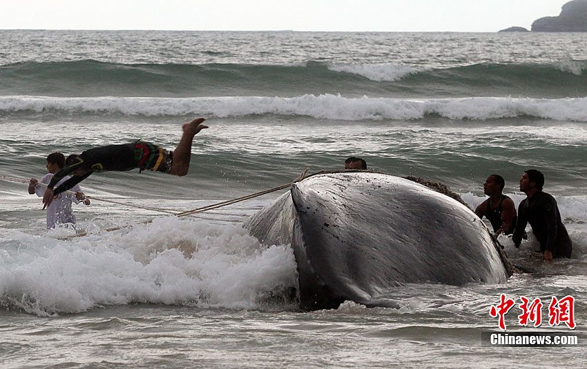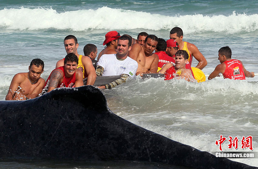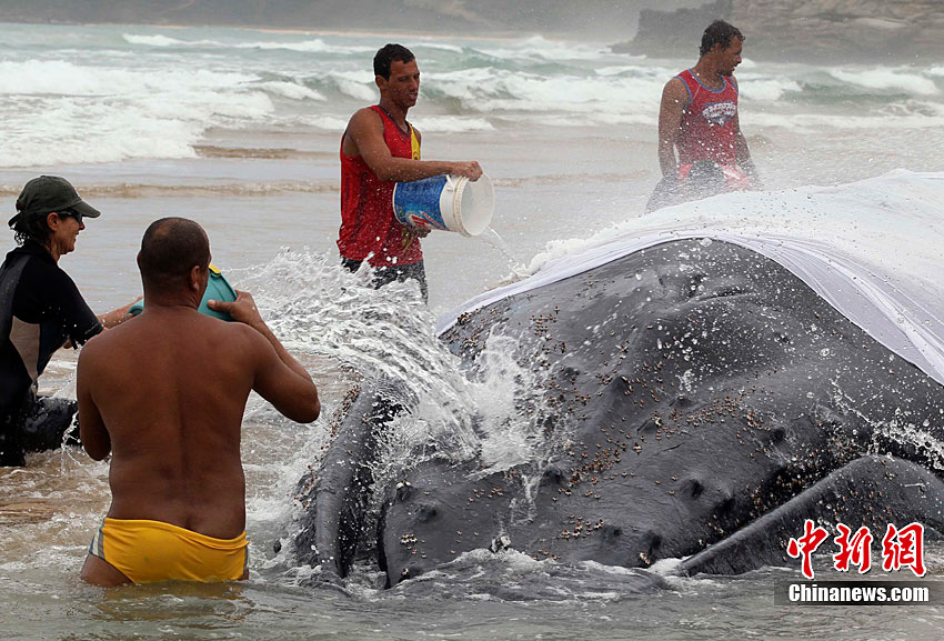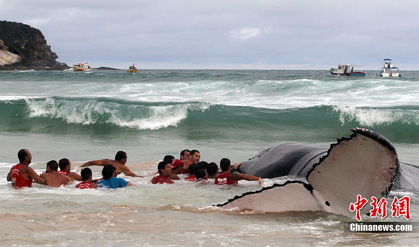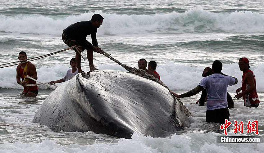 當?shù)貢r間10月26日,在距離巴西里約熱內(nèi)盧192公里的布濟烏斯,救援人員試圖挪動擱淺的座頭鯨。座頭鯨每年7月到11月從南極洲向北遷往巴西海域交配。