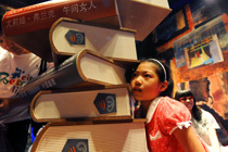 5月4日,上海世博園一名游客頭戴東方之冠手持世博護照。中新社記者 廖攀 攝