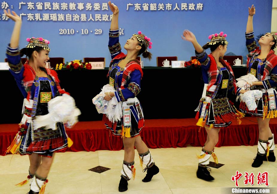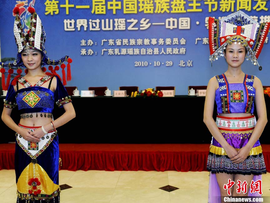 10月29日,第十一屆中國瑤族盤王節(jié)新聞發(fā)布會暨世界過山瑤之鄉(xiāng)——中國乳源旅游推介會在人民大會堂召開。本次會議發(fā)布,世界瑤族人民的盛會——第十一屆中國瑤族盤王節(jié)將于2010年11月20日至22日在廣東乳源瑤族自治縣隆重舉行,幾灞P王節(jié)是瑤族人民紀(jì)念其始祖盤王(盤瓠)的盛大節(jié)日。圖為“瑤族公主”形象代表身著湘粵桂南嶺地區(qū)的瑤族盛裝亮相新聞發(fā)布會。中新社記者 劉震 攝