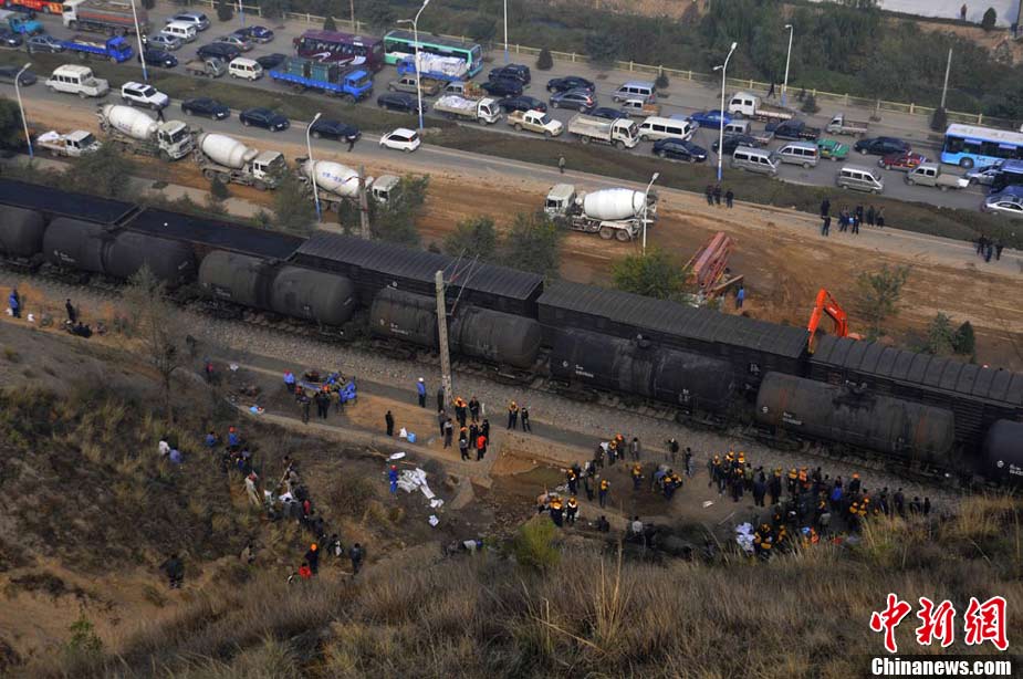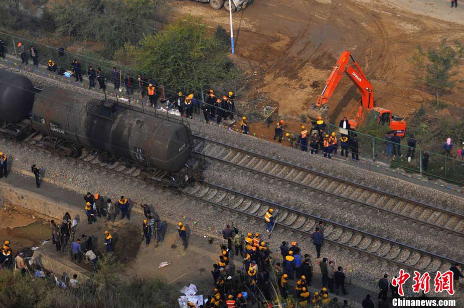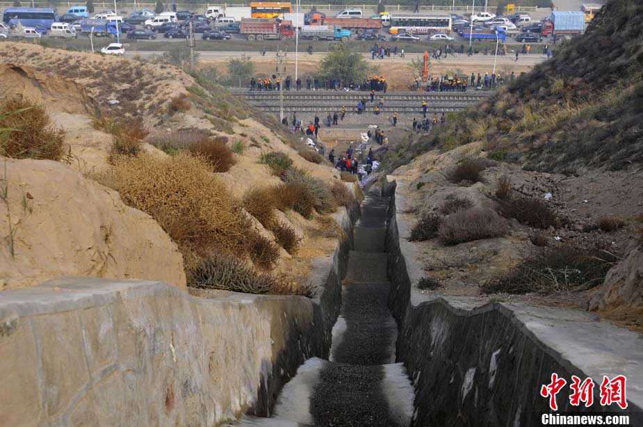 10月30日早晨,蘭新鐵路線遭水害遇險(xiǎn)情,蘭新線K8+500米處南側(cè)山上,有廢水從山體沖下,將蘭新線上下行路基沖穿,嚴(yán)重危及行車安全。根據(jù)鐵路部門的測量,上行路基一側(cè)被沖塌形成了50立方米的坑,下行路基一側(cè)沖塌形成的坑有24立方米。蘭州鐵路局等組織7臺大型機(jī)械,共有700多人投入搶險(xiǎn)。經(jīng)全力奮戰(zhàn),11時(shí)整,蘭新線下行線路開通;11時(shí)15分,蘭新線上行線路開通。楊艷敏 攝