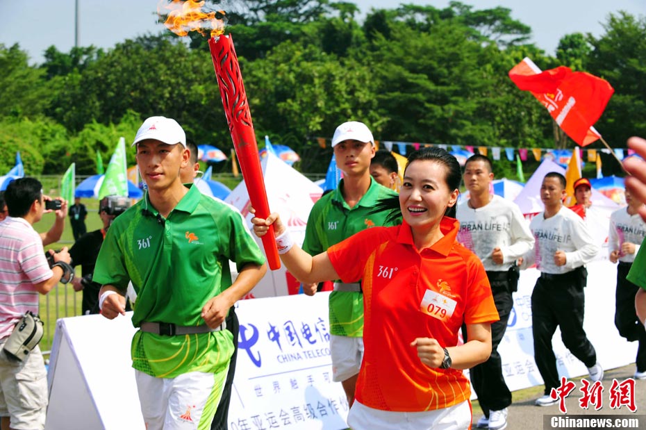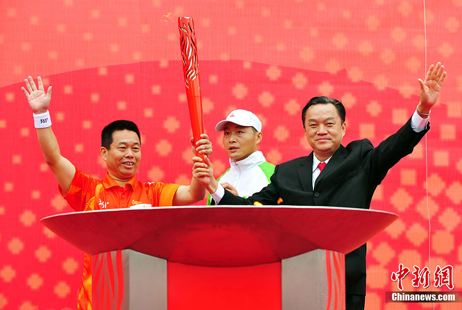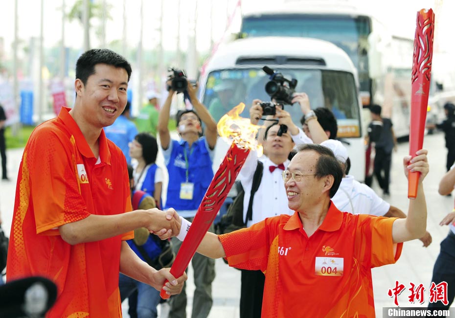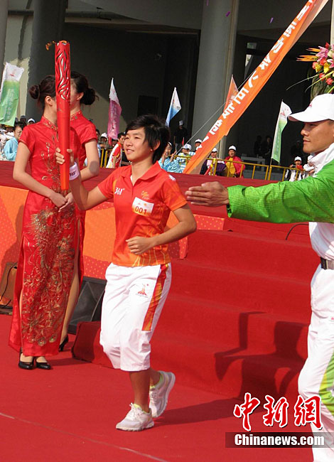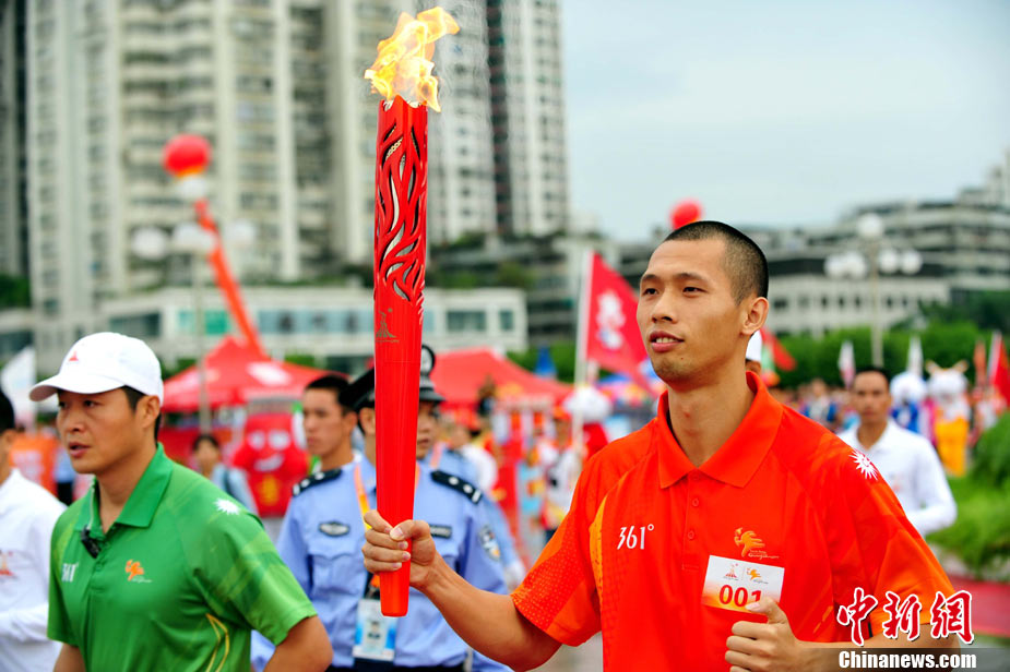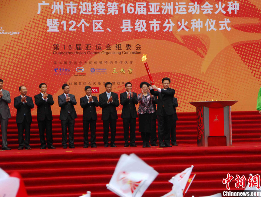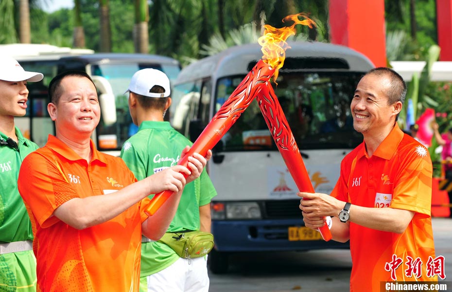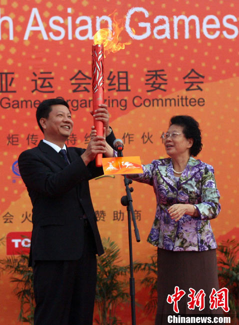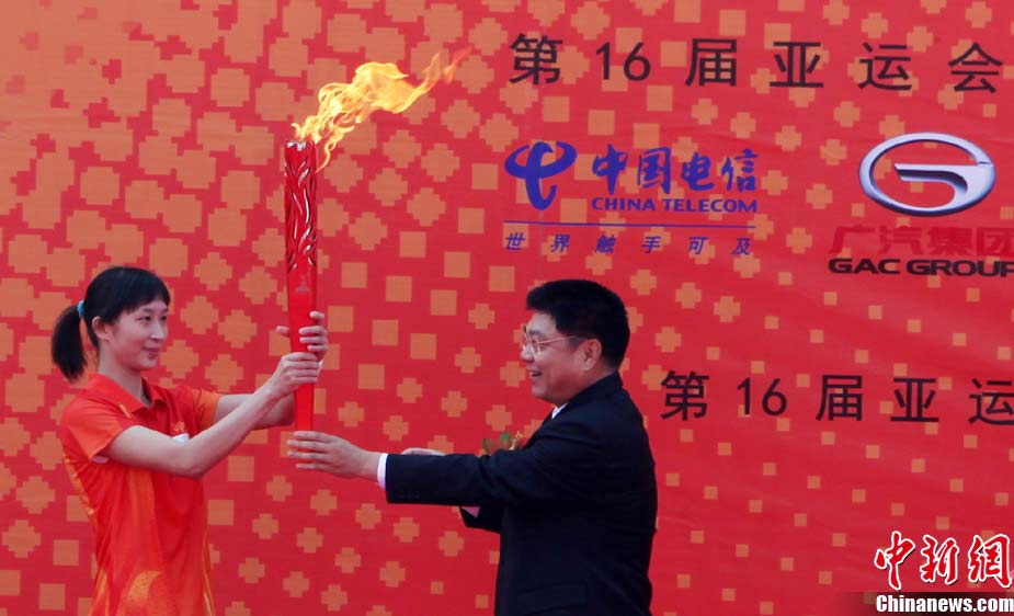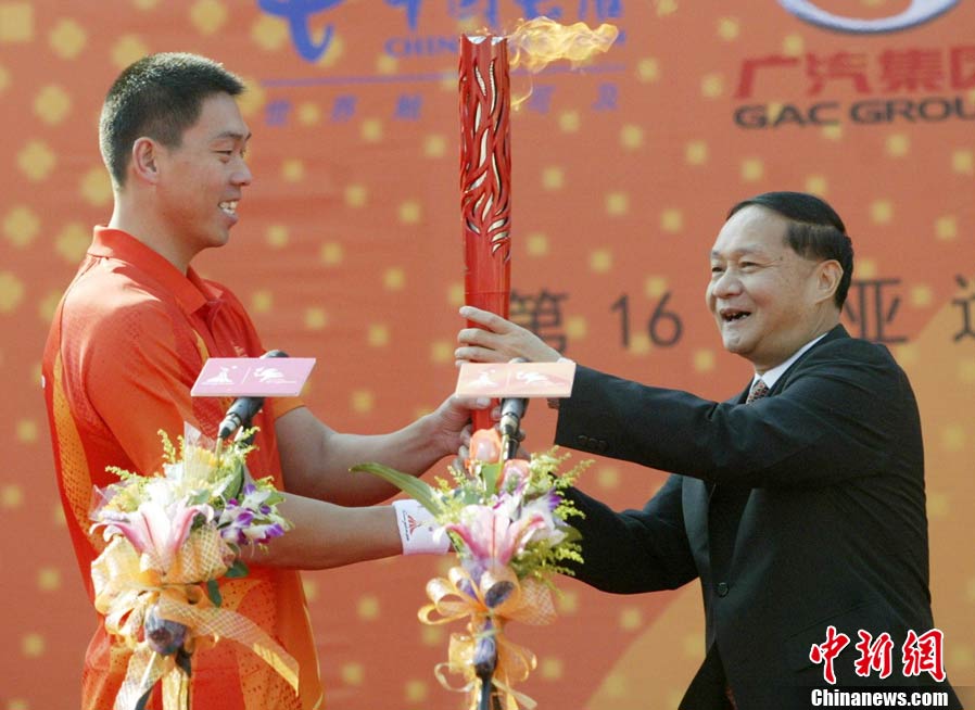 10月30日,第16屆亞洲運(yùn)動(dòng)會(huì)火炬在“禪宗六祖慧能故鄉(xiāng)”廣東云浮進(jìn)行傳遞。圖為浮市委副書記姚康與云浮站最后一棒火炬手、奧運(yùn)冠軍鄒市明。
