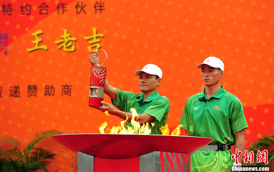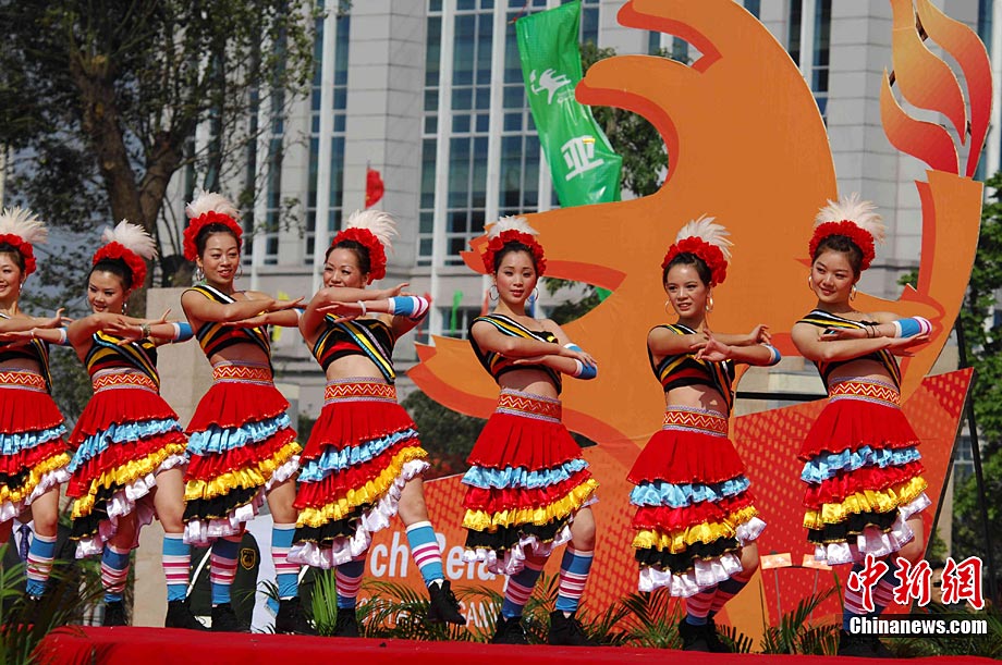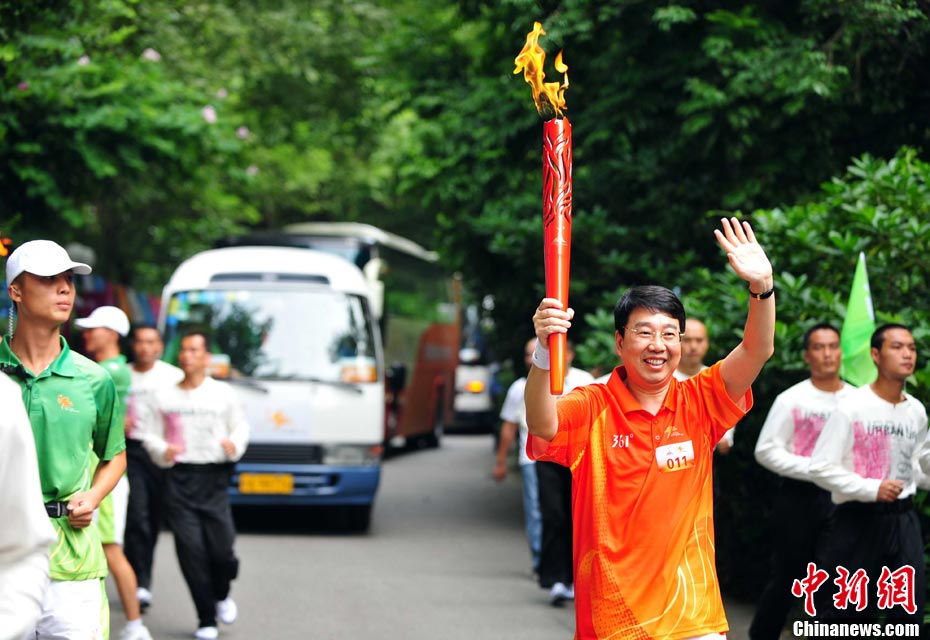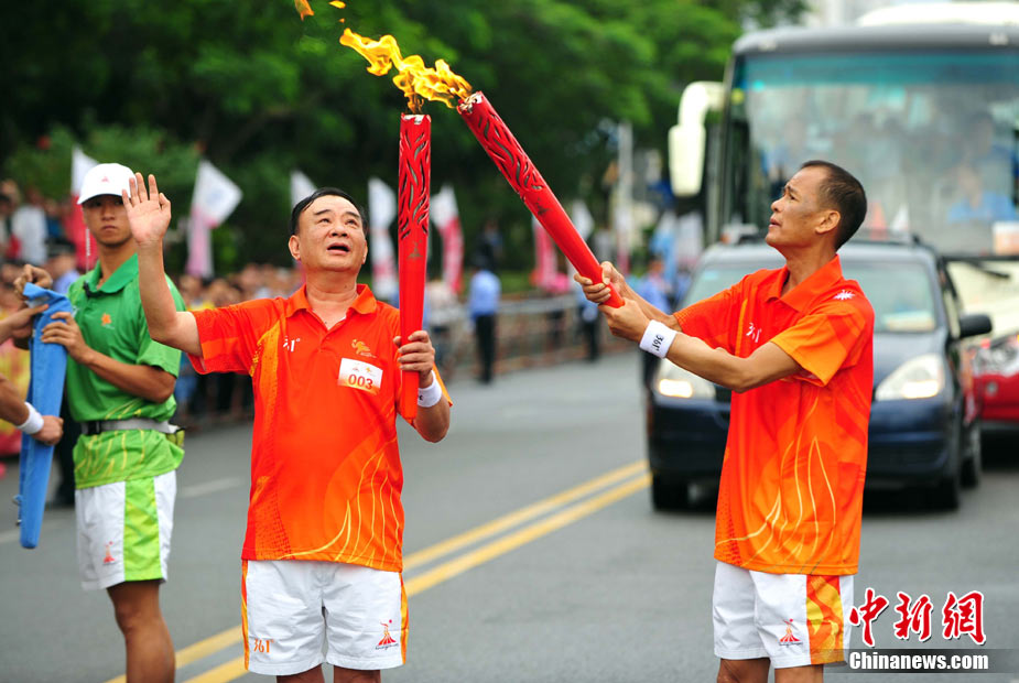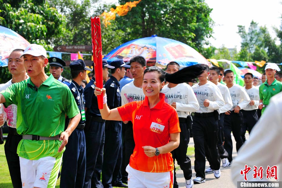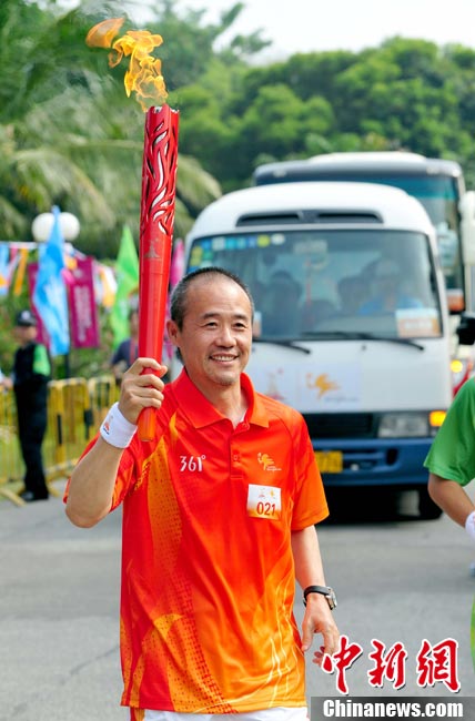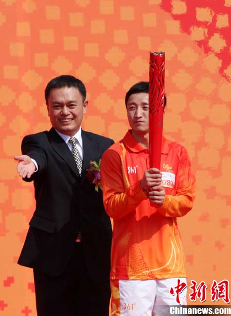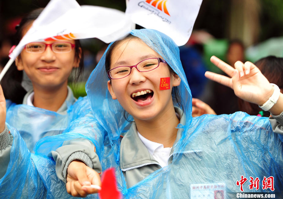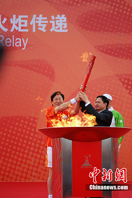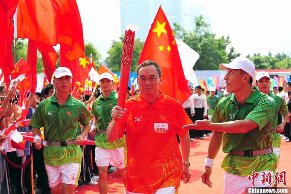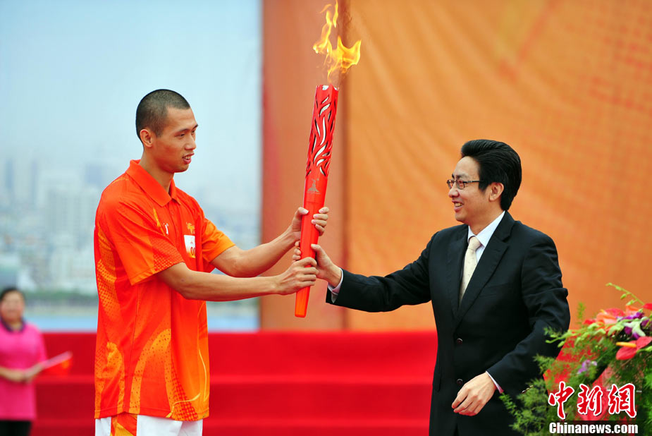 10月30日,第16屆亞洲運(yùn)動(dòng)會(huì)火炬在“禪宗六祖慧能故鄉(xiāng)”廣東云浮進(jìn)行傳遞。圖為浮市委副書記姚康與云浮站最后一棒火炬手、奧運(yùn)冠軍鄒市明。