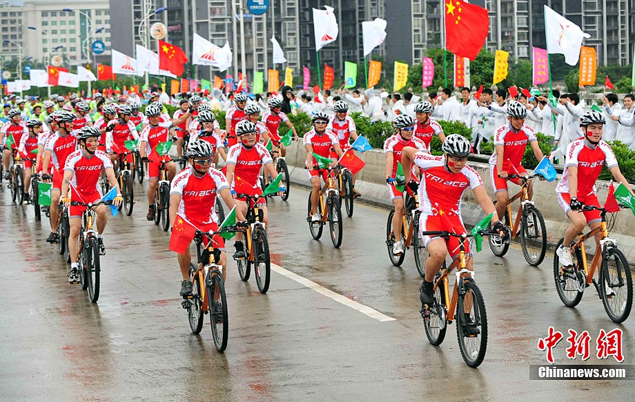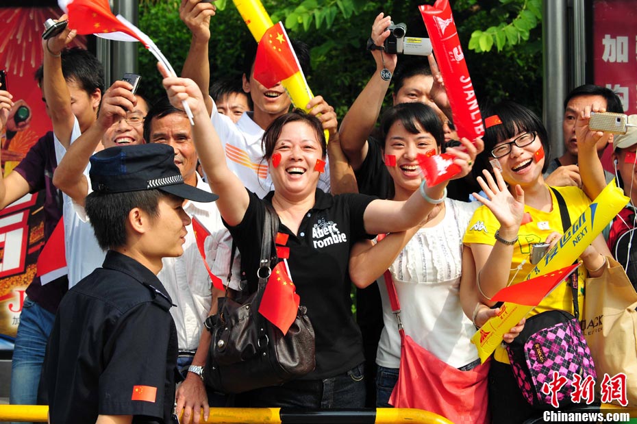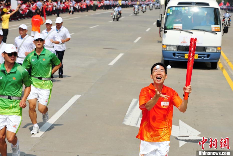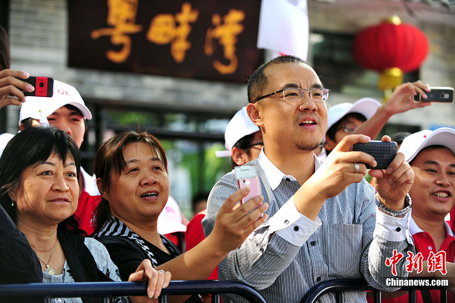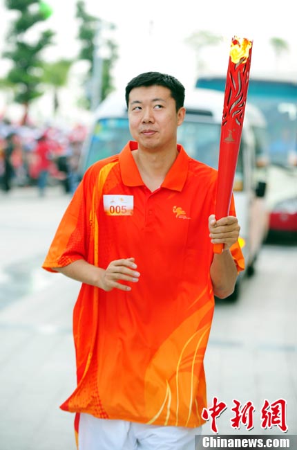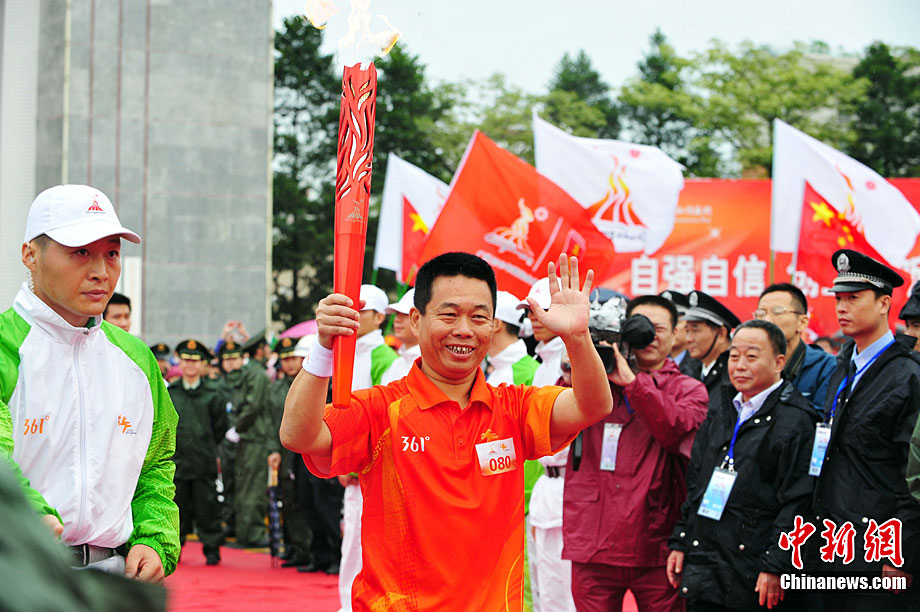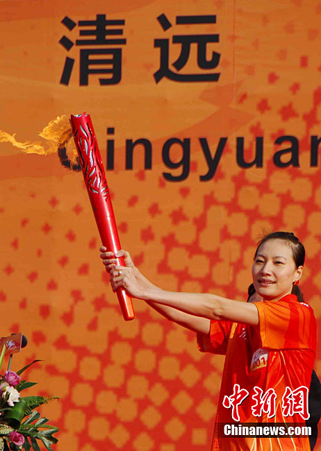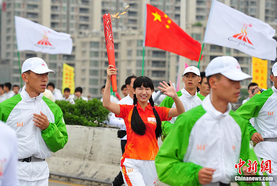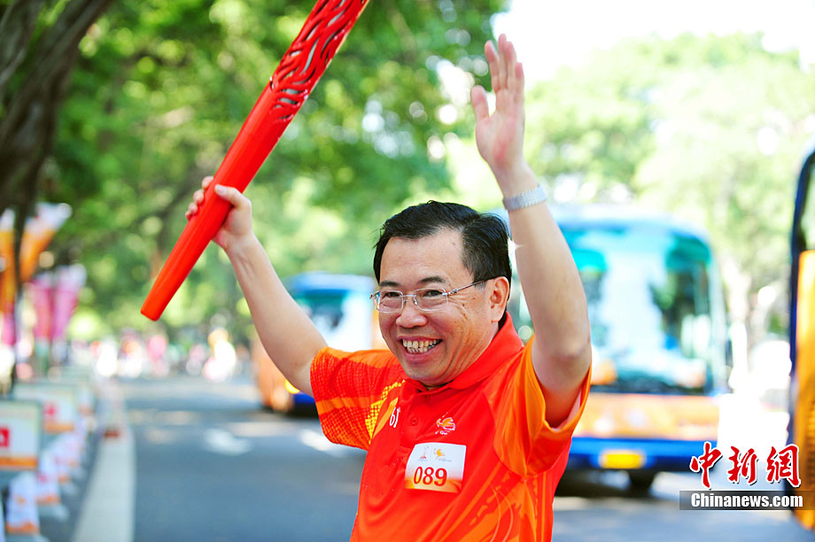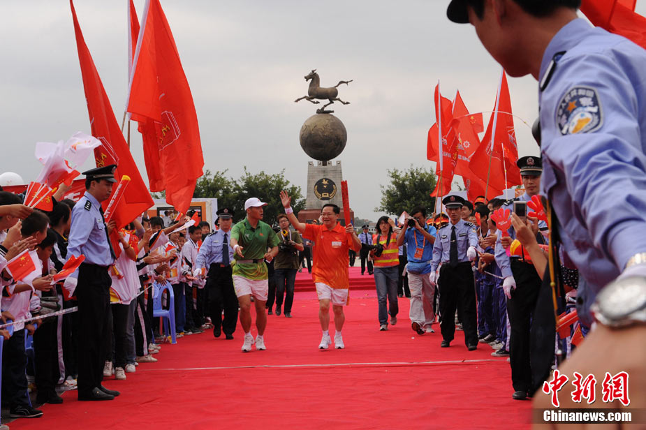 10月30日,第16屆亞洲運(yùn)動(dòng)會(huì)火炬在“禪宗六祖慧能故鄉(xiāng)”廣東云浮進(jìn)行傳遞。圖為浮市委副書記姚康與云浮站最后一棒火炬手、奧運(yùn)冠軍鄒市明。