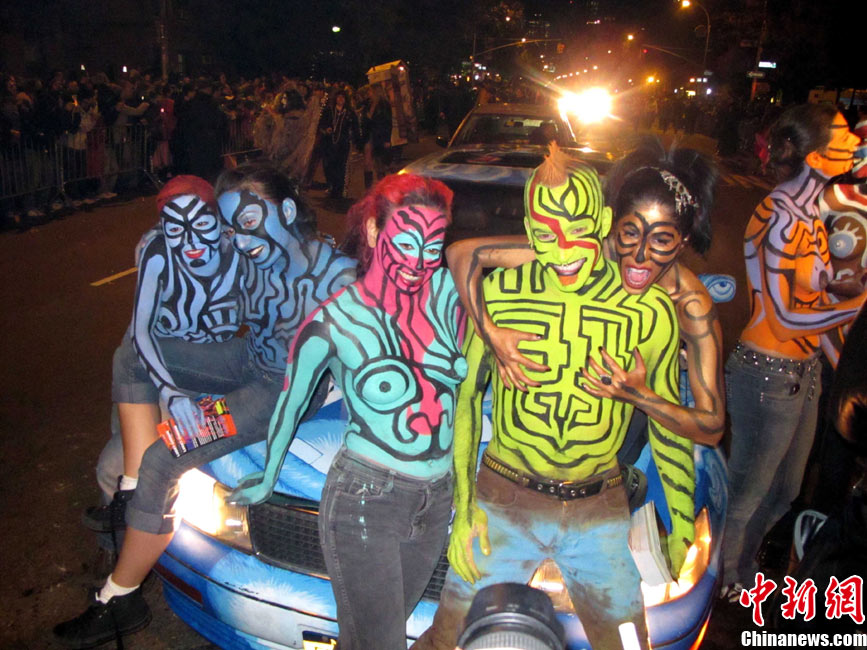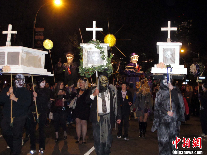 當(dāng)?shù)貢r(shí)間10月31日晚,一年一度的紐約萬圣節(jié)前夜狂歡大游行在紐約第六大道舉行,這是全世界最大的萬圣節(jié)游行。中新社記者 孫宇挺 攝