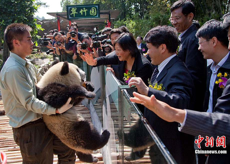 11月2日,在廣州亞運會倒計時10天之際,國家林業(yè)局、廣東省人民政府、廣州亞組委在廣州市香江野生動物世界長隆大熊貓中心舉行了隆重的啟動儀式,由12只國寶熊貓的組成“亞運助威團”正式與游客見面。袁宏偉 攝 圖片來源:cnsphoto