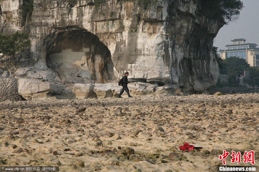 2010年11月4日,廣西桂林,象鼻山前干涸的河床。入秋以來,桂林持續(xù)干旱,漓江水位下降,進(jìn)入秋冬枯水期。李凱 攝 圖片來源:CFP視覺中國