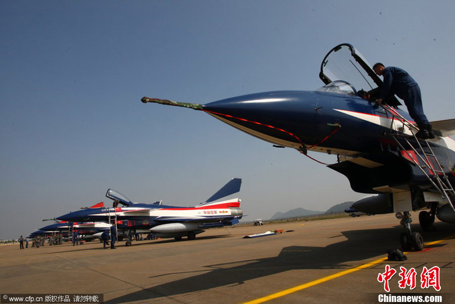 2010年11月8日,中國空軍“八一”飛行表演隊的7架殲十表演機從華北某機場起飛,經(jīng)過約2個半小時的飛行,飛抵珠海三灶機場。將在珠海航展上進行一系列的精彩特技表演。林森 攝 圖片來源:CFP視覺中國